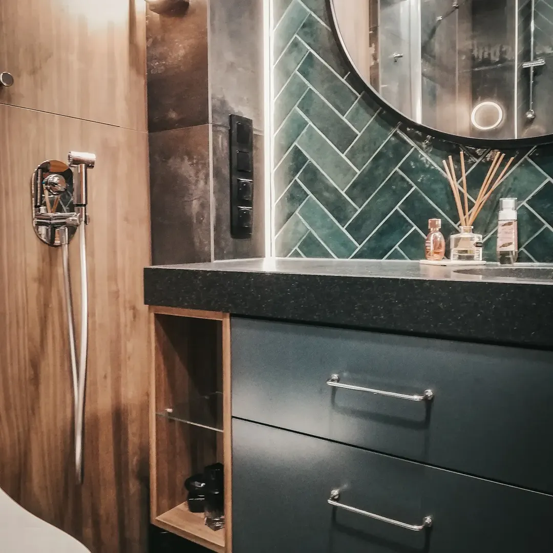 Now this is a vibe shift—in the best way. Deep tones, rich textures, and that bold green tile bring a cozy, almost boutique-hotel energy.