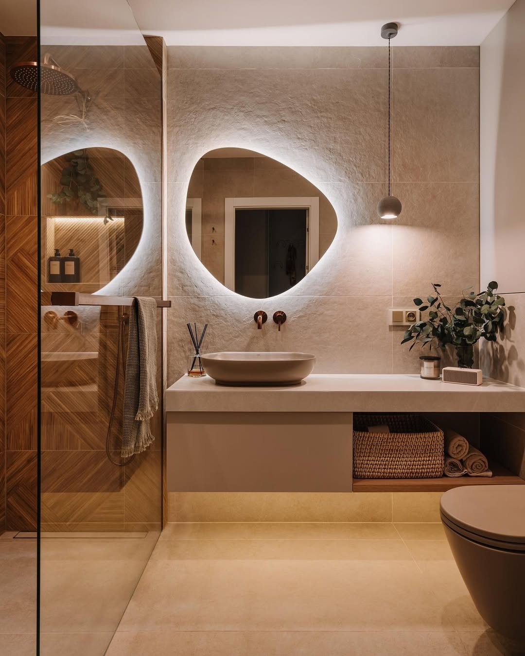 Those mirrors alone deserve attention. The soft, organic shapes paired with backlighting turn the whole wall into a design feature.