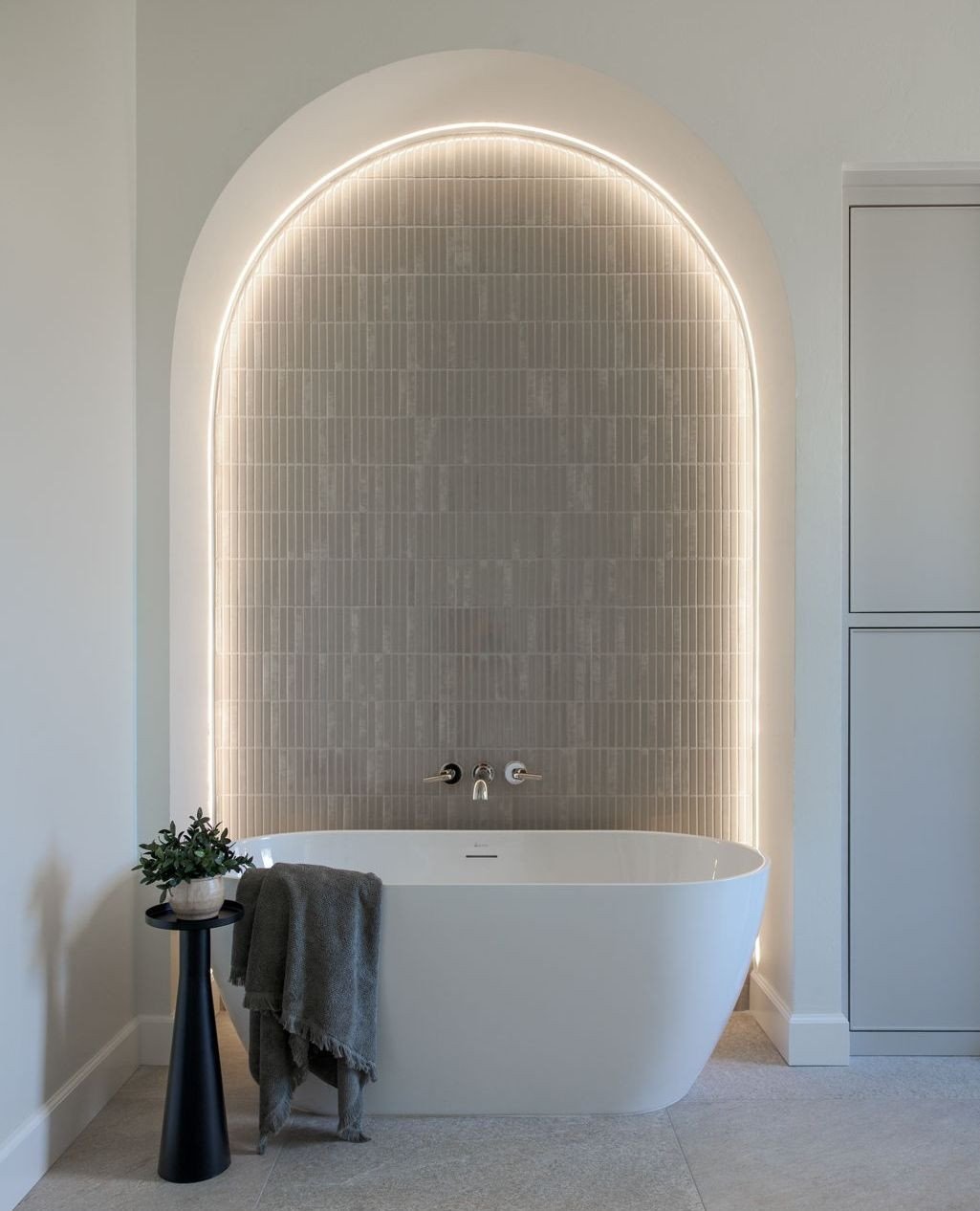 That glowing arch instantly pulls you in. It frames the tub like it’s the main character, and honestly, it deserves to be.
