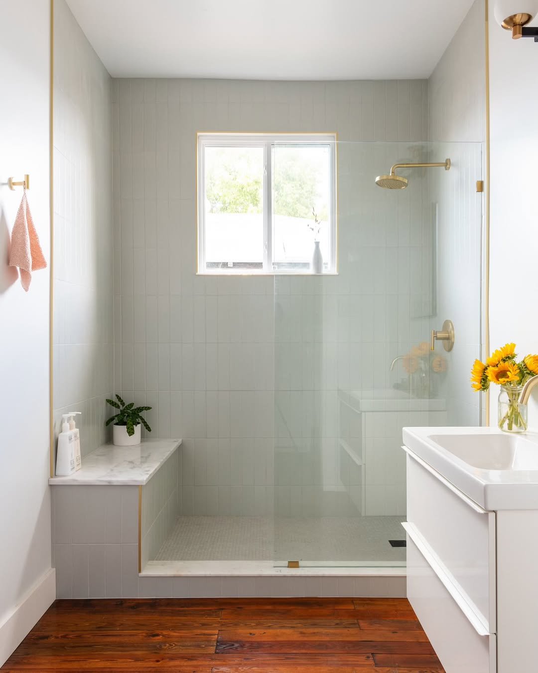 Light, airy, and just a little playful. The soft tones and glass shower keep things open, while the wood flooring adds warmth.