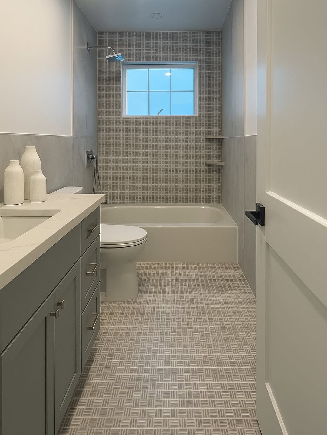 This one feels like a quiet morning wrapped in neutrals. The subtle patterned tile running from floor to shower wall creates this seamless, almost meditative flow.