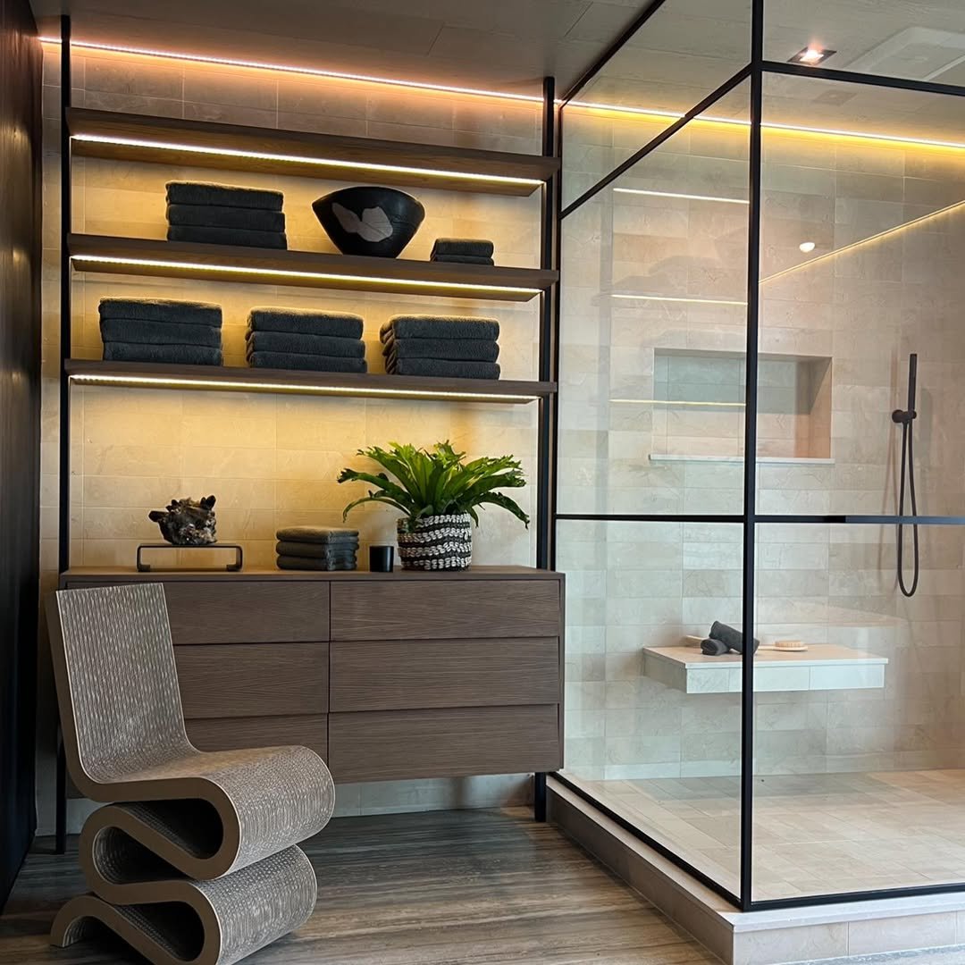 This feels like stepping into a boutique spa. The open shelving, warm lighting, and wood tones create a cozy but elevated vibe.