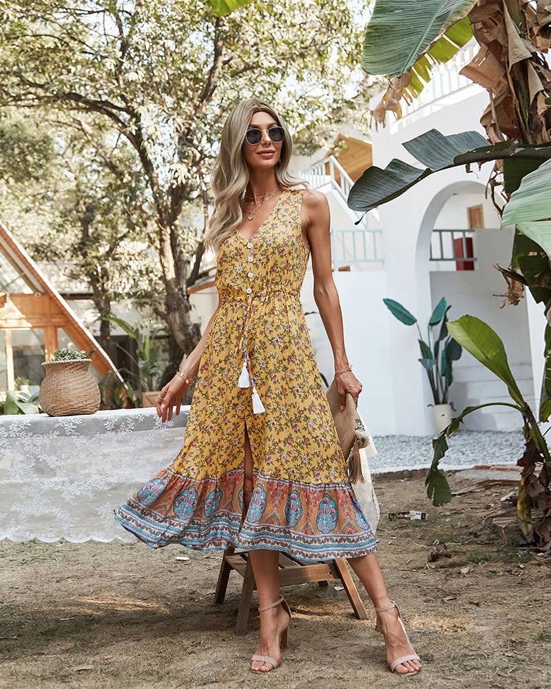 A mustard floral midi with a paisley border hem feels like golden hour stitched into fabric. The tassel tie at the waist adds movement, and that soft front slit gives just enough sway when you walk.