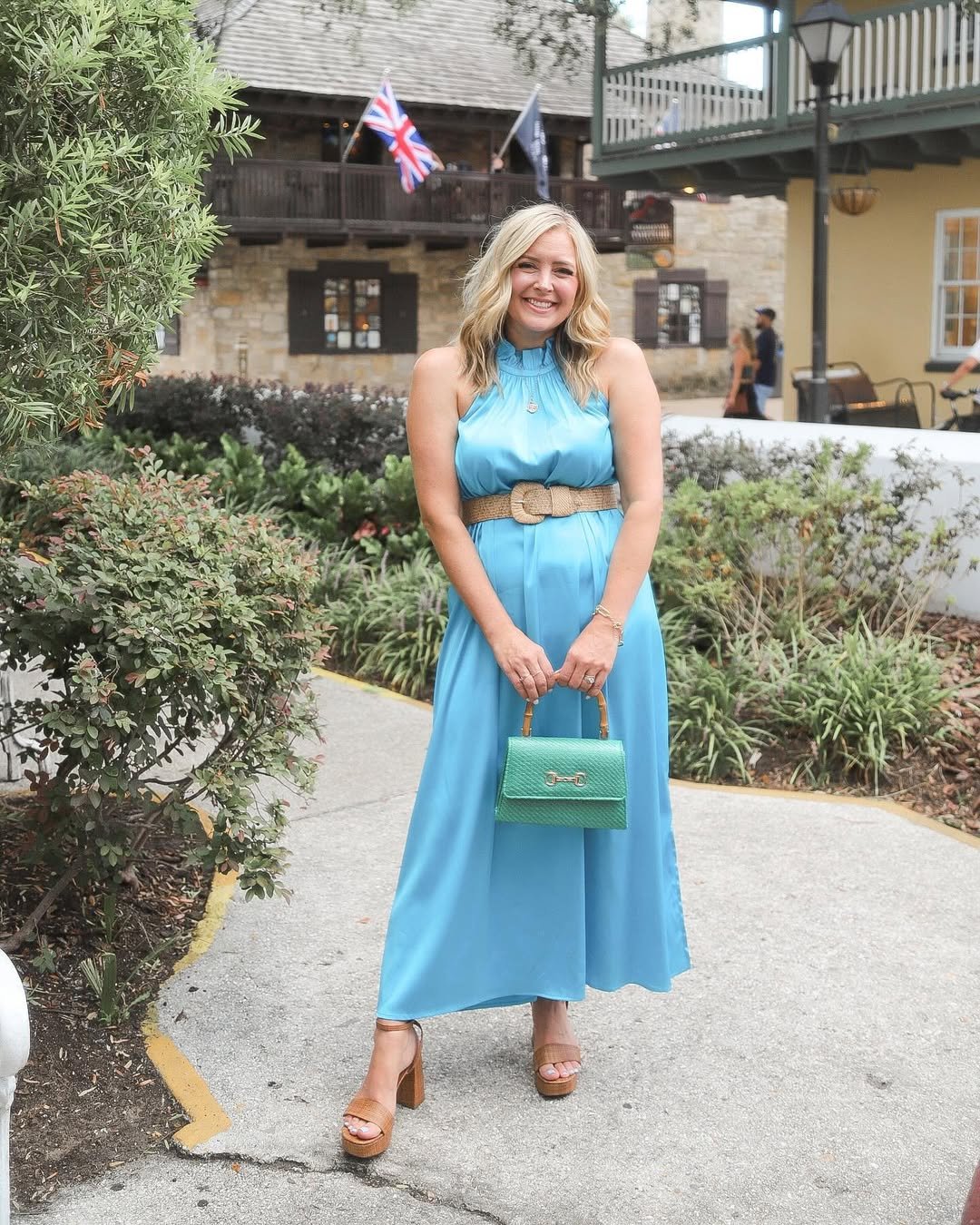 A sky-blue halter maxi cinched with a woven belt brings that breezy coastal charm. The flowy silhouette keeps it comfortable, while the belted waist defines the shape beautifully.