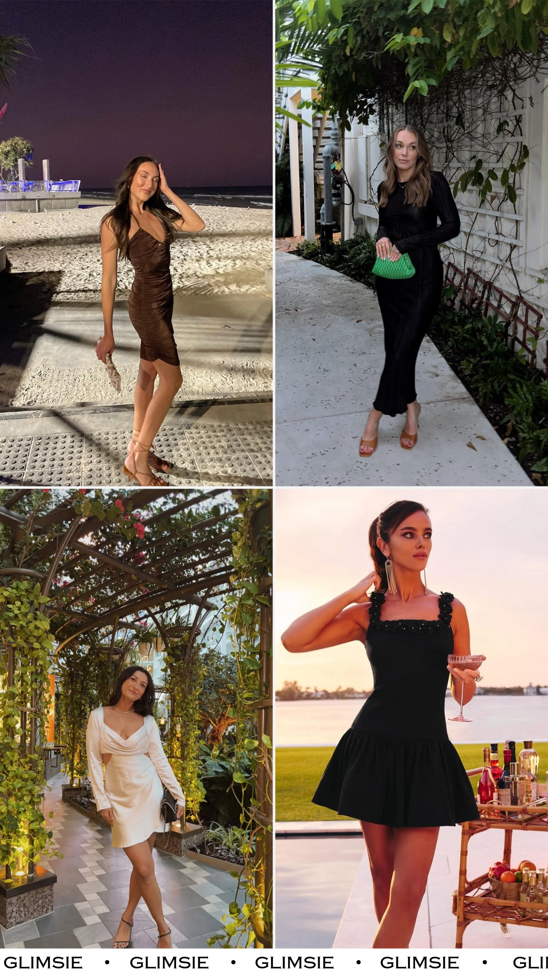 There’s something about brown at night that feels richer than black. It glows under city lights and pairs beautifully with strappy heels and loose waves. This is the dress for seaside cocktails, salty air, and a little hand-holding before dessert.
