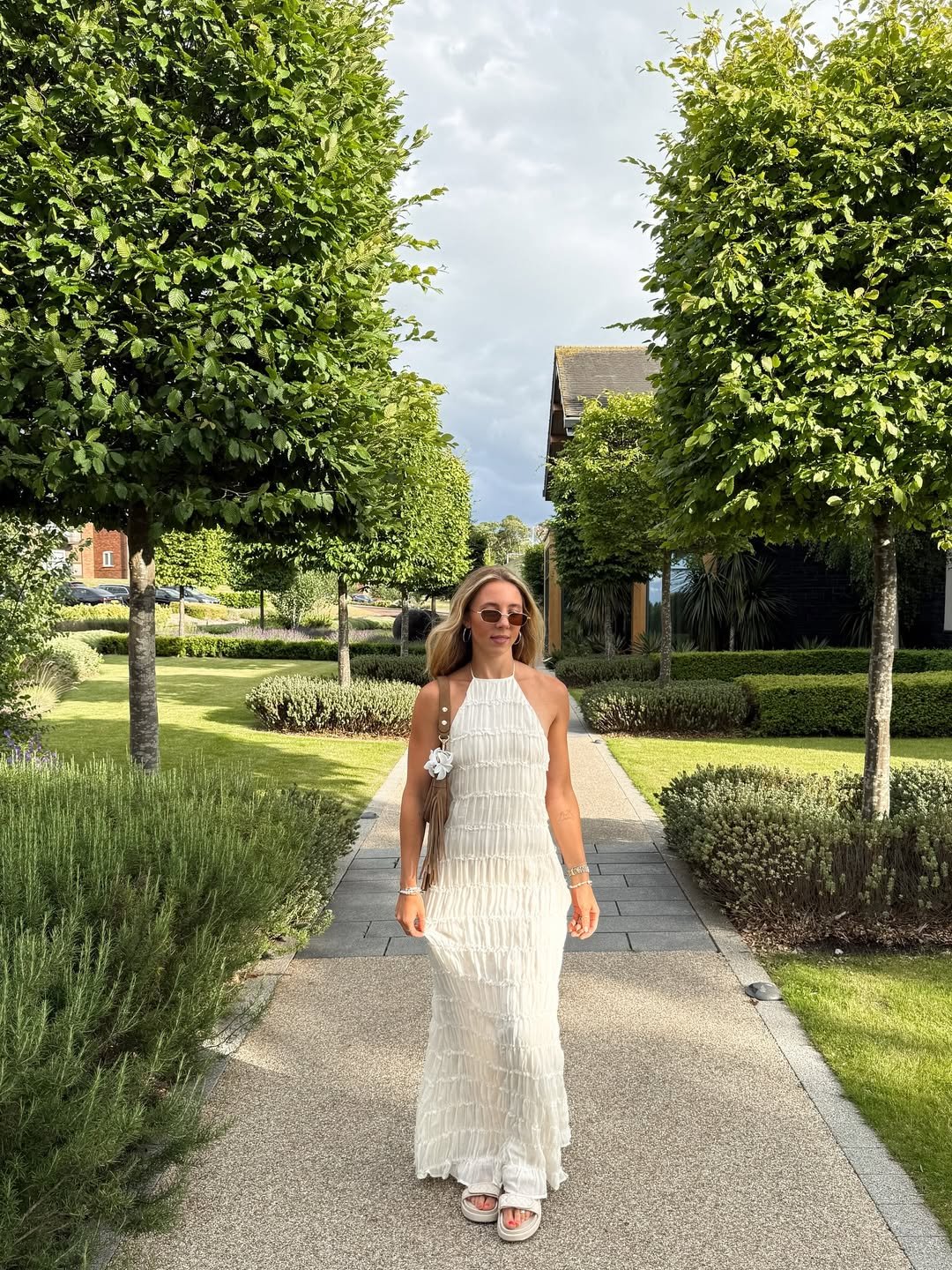 Tucked under a pergola with blooming vines, it feels cinematic. I’d style it with soft curls and simple sandals to keep the focus on the print. It’s romantic without trying too hard, which is always the sweet spot.