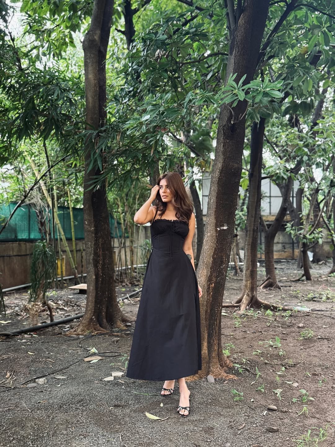 A structured black midi with a corset-inspired bodice feels timeless against a backdrop of trees. The clean neckline and flowing skirt strike that balance between romantic and powerful.