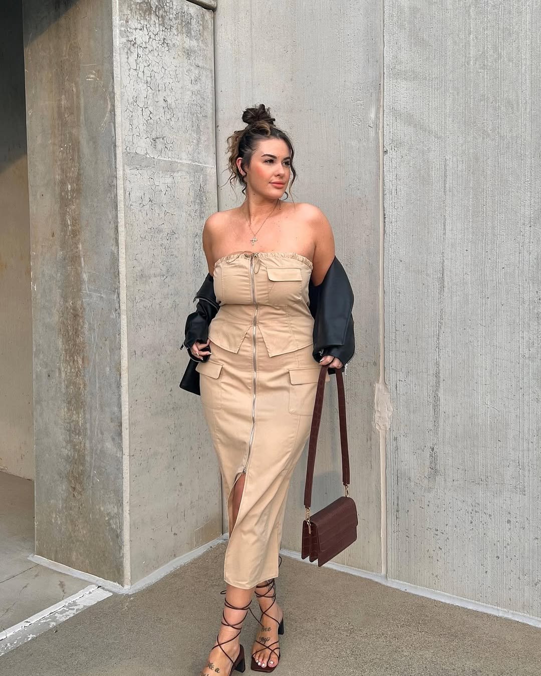 This strapless beige midi brings a little edge to the romance of spring. The structured bodice, front zip detail, and subtle cargo pockets give it a cool-girl twist, while the fitted shape keeps it undeniably feminine.