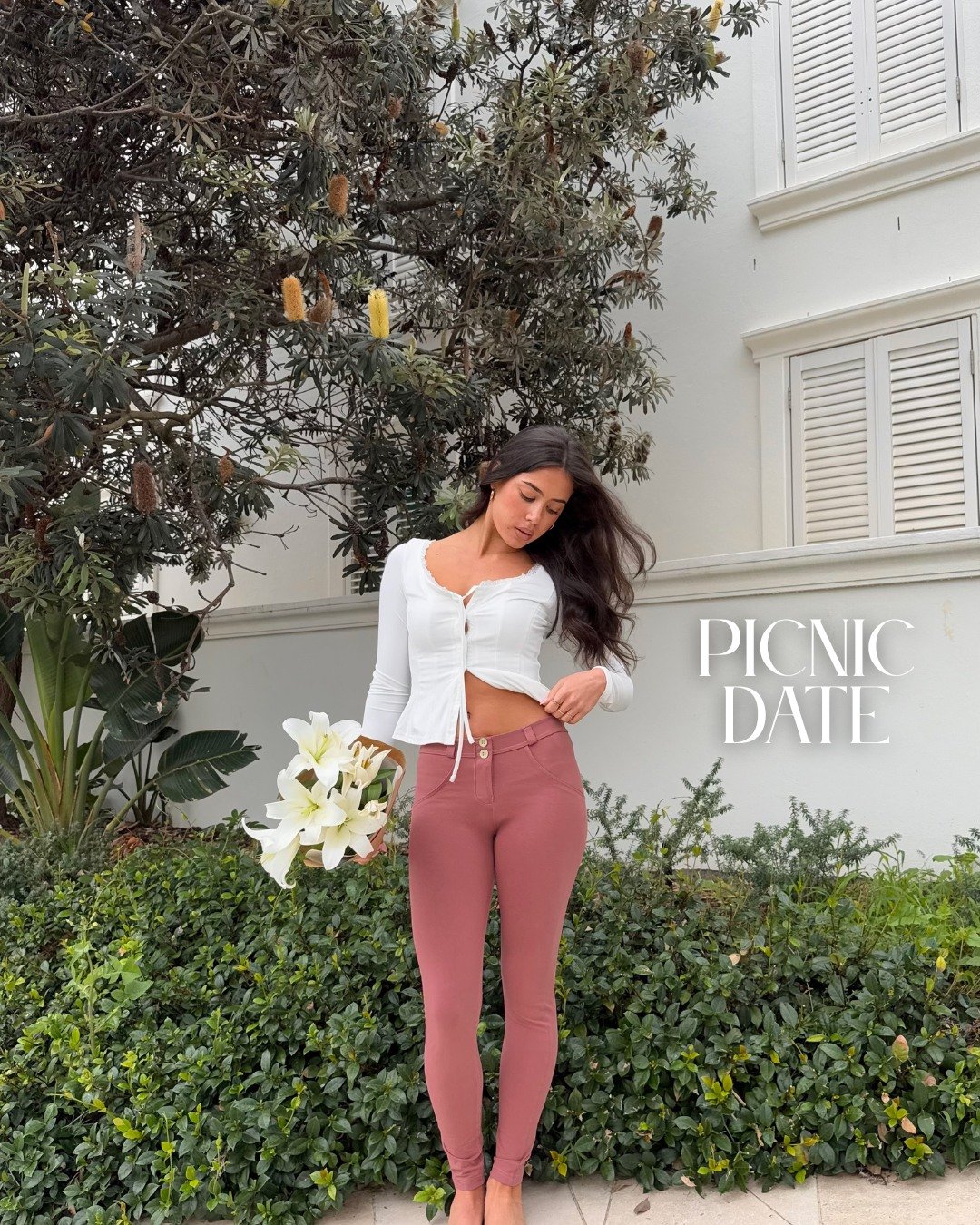 A fitted white cardigan with blush-toned skinny jeans feels fresh and playful for a daytime spring date. It’s flirty but relaxed, especially styled with soft waves and a bouquet of lilies in hand.