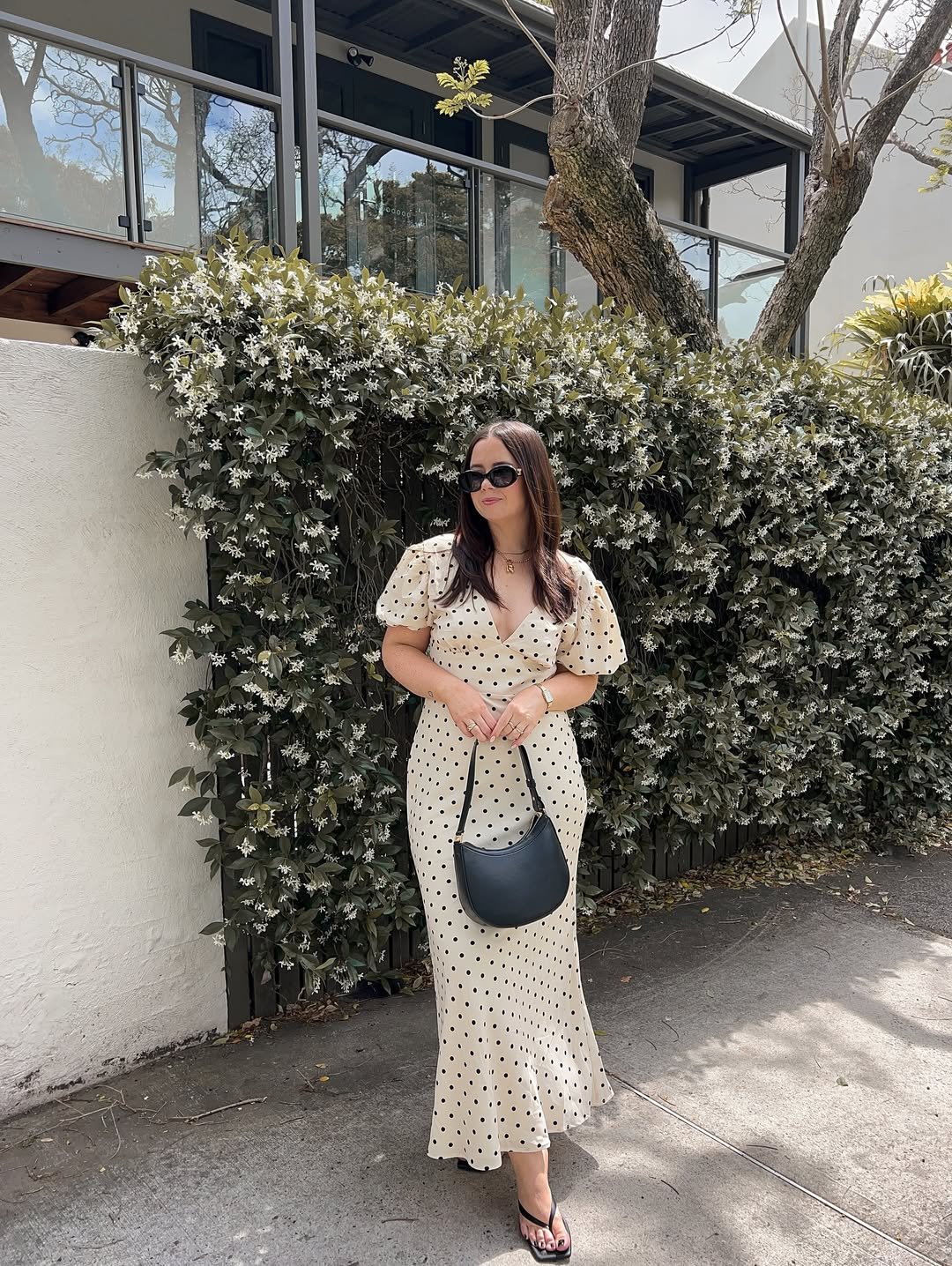A cream polka dot maxi with puff sleeves and a gentle flare at the hem feels like spring in its most charming form. The wrap-style bodice adds shape, while the print keeps it playful.