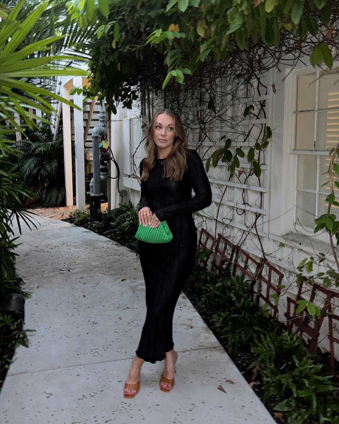 What really makes it pop is that unexpected green clutch. It’s proof that a single bold accessory can transform an entire look. Perfect for a chic dinner spot where less truly feels like more.