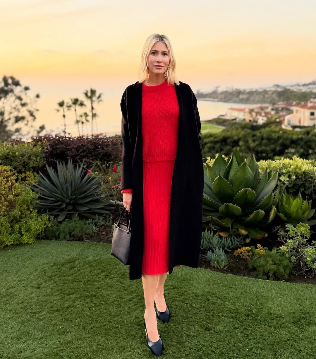 There’s something so striking about red against a coastal sunset. It’s strong, clean, and unforgettable. Keep the accessories sleek, think black pumps and a structured handbag, so the color stays center stage. This is the kind of look that says you planned the reservation and ordered the wine.