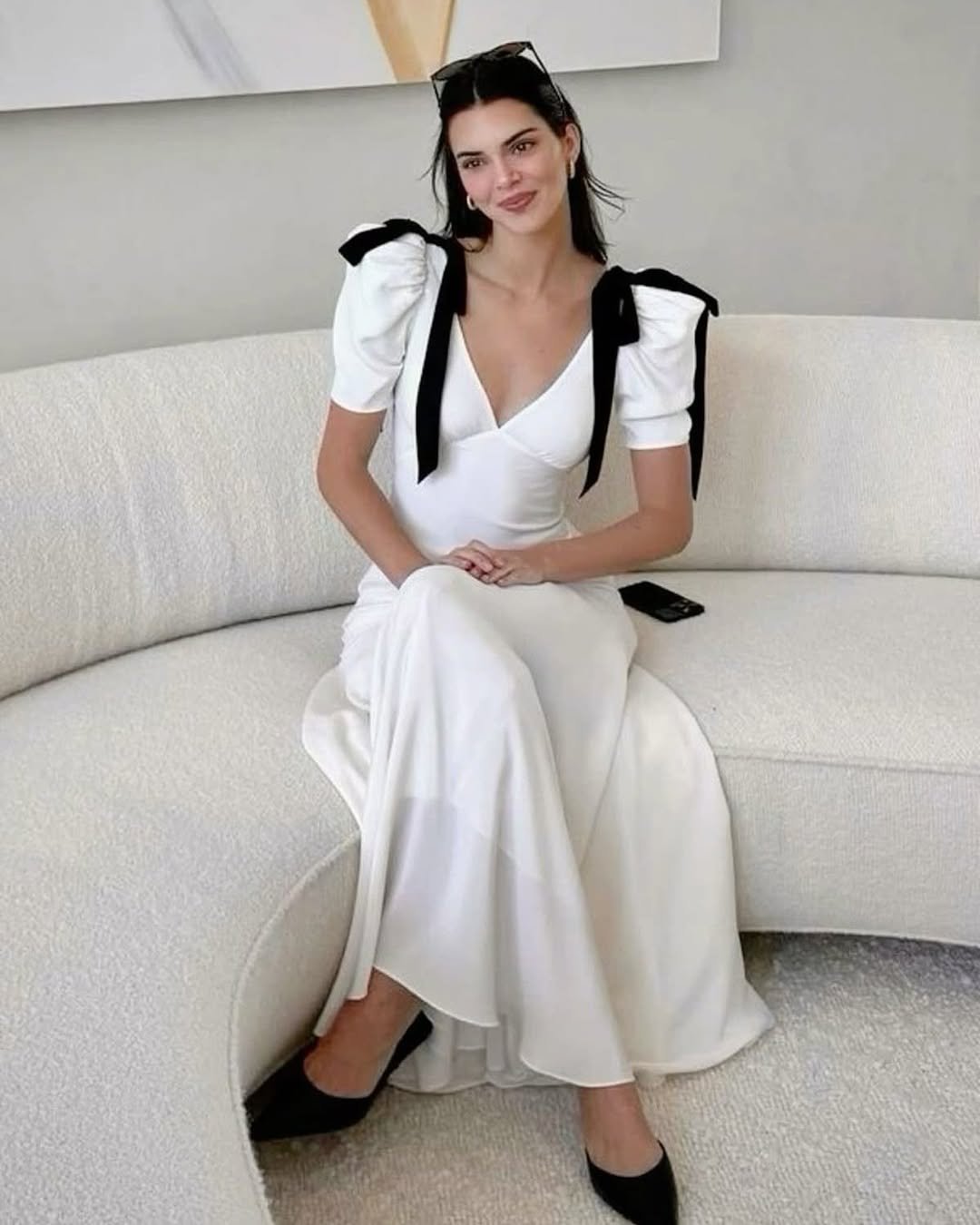 There’s something about a white dress with black bows that feels straight out of an Upper East Side romance. The fitted bodice and soft V neckline keep it feminine, while those structured shoulder ties add just enough drama to make it memorable.