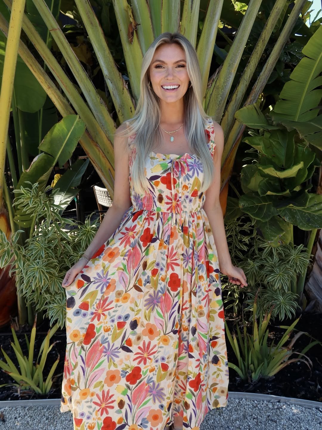 A tiered halter maxi with delicate palm prints feels like spring vacation energy. The structured waistline and flowing layers create movement that’s made for golden-hour walks.