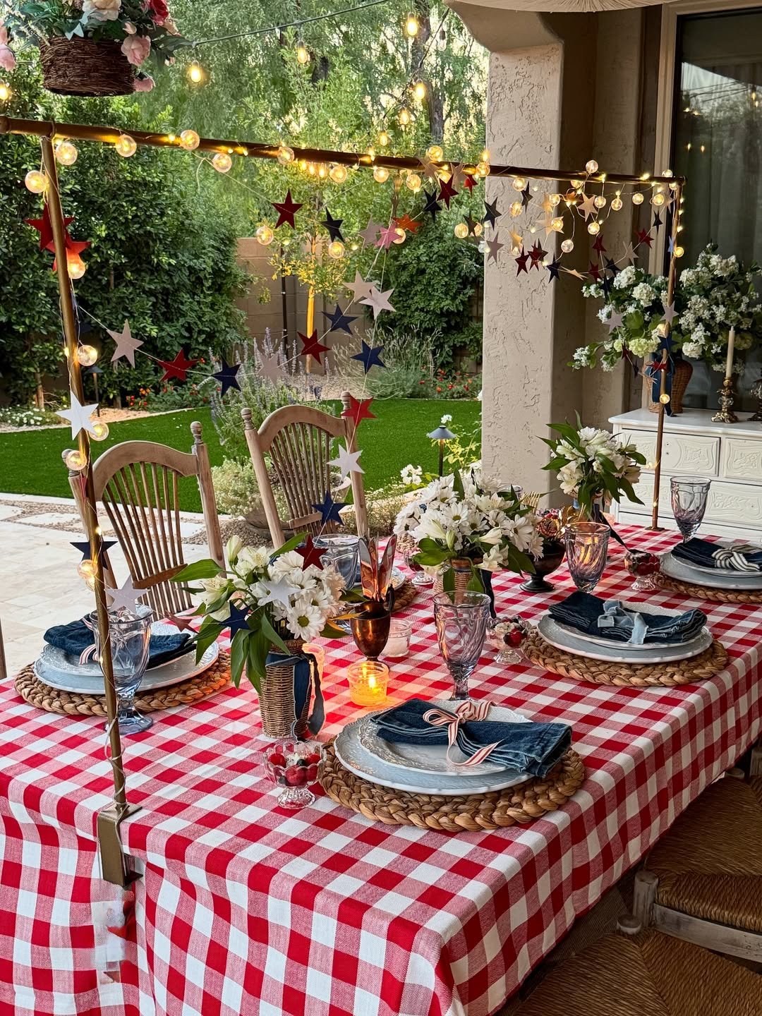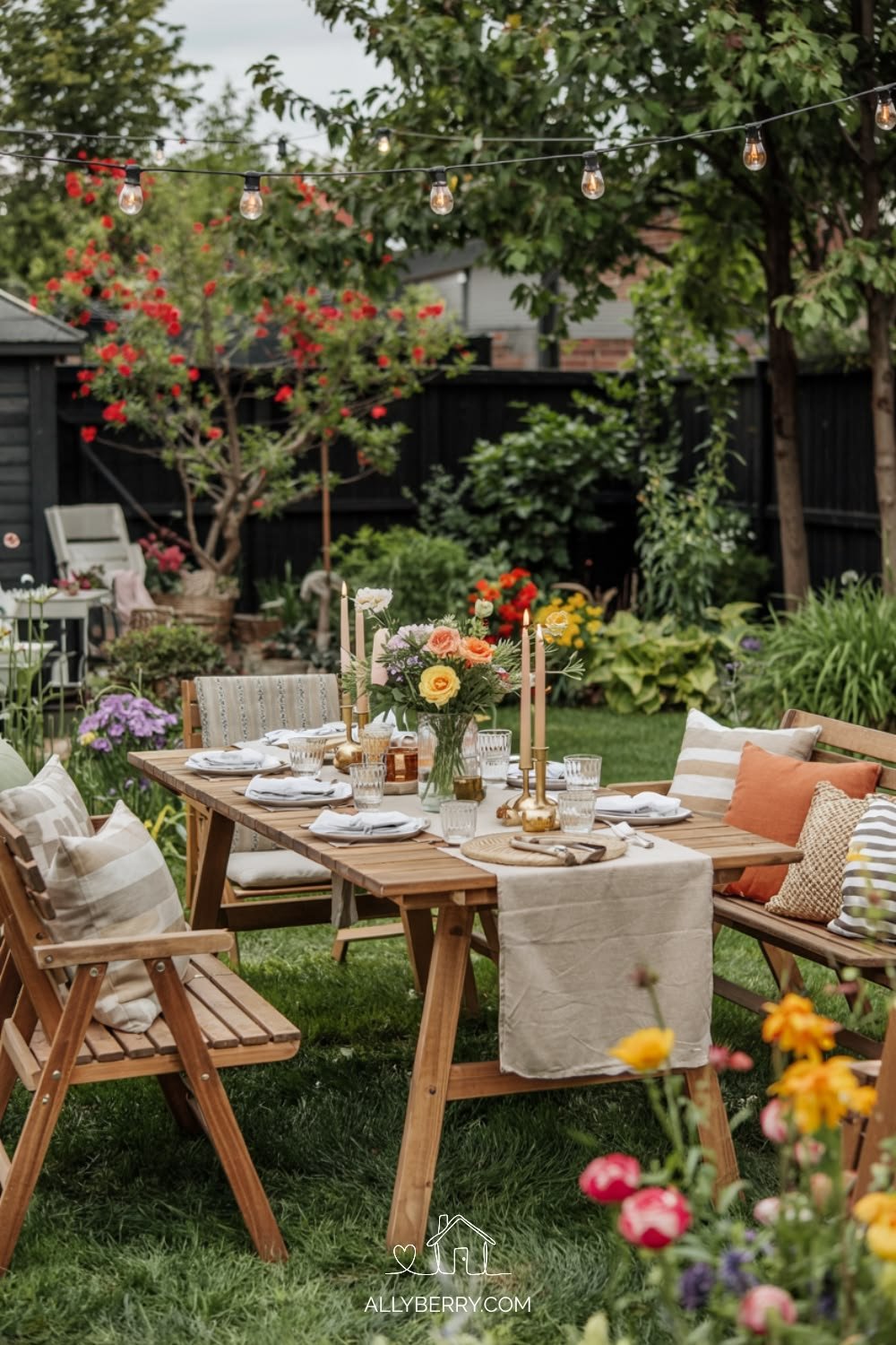 There’s an easy charm here that feels instantly inviting. Wooden textures, neutral linens, and a loose bouquet at the center create that relaxed, lived-in outdoor setting that never tries too hard.