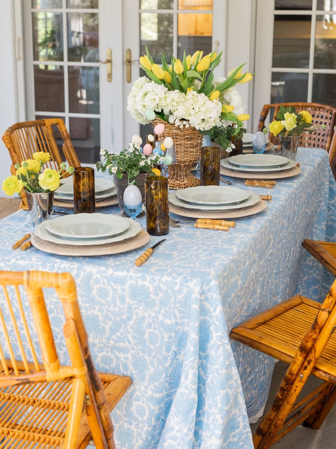 A soft blue tablecloth paired with bright yellow tulips brings that classic spring contrast to life. Woven textures and amber glass add depth, keeping the palette from feeling too light.