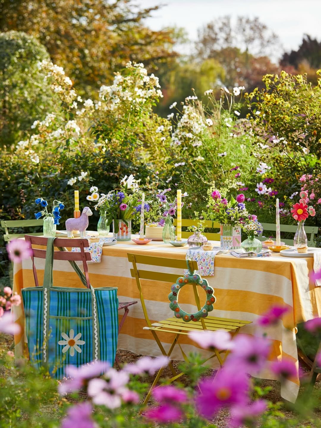 This table feels like pure sunshine. Bold stripes, bright florals, and playful details bring an energy that’s impossible to ignore, like a picnic that spilled into a garden party.