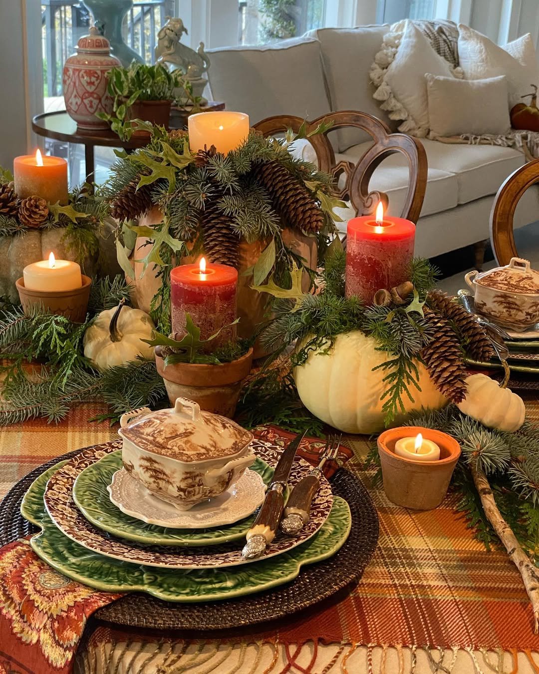 This table leans into richness, with layered textiles, deep tones, and glowing candlelight. Pinecones, greenery, and warm ceramics create a look that feels grounded and full.