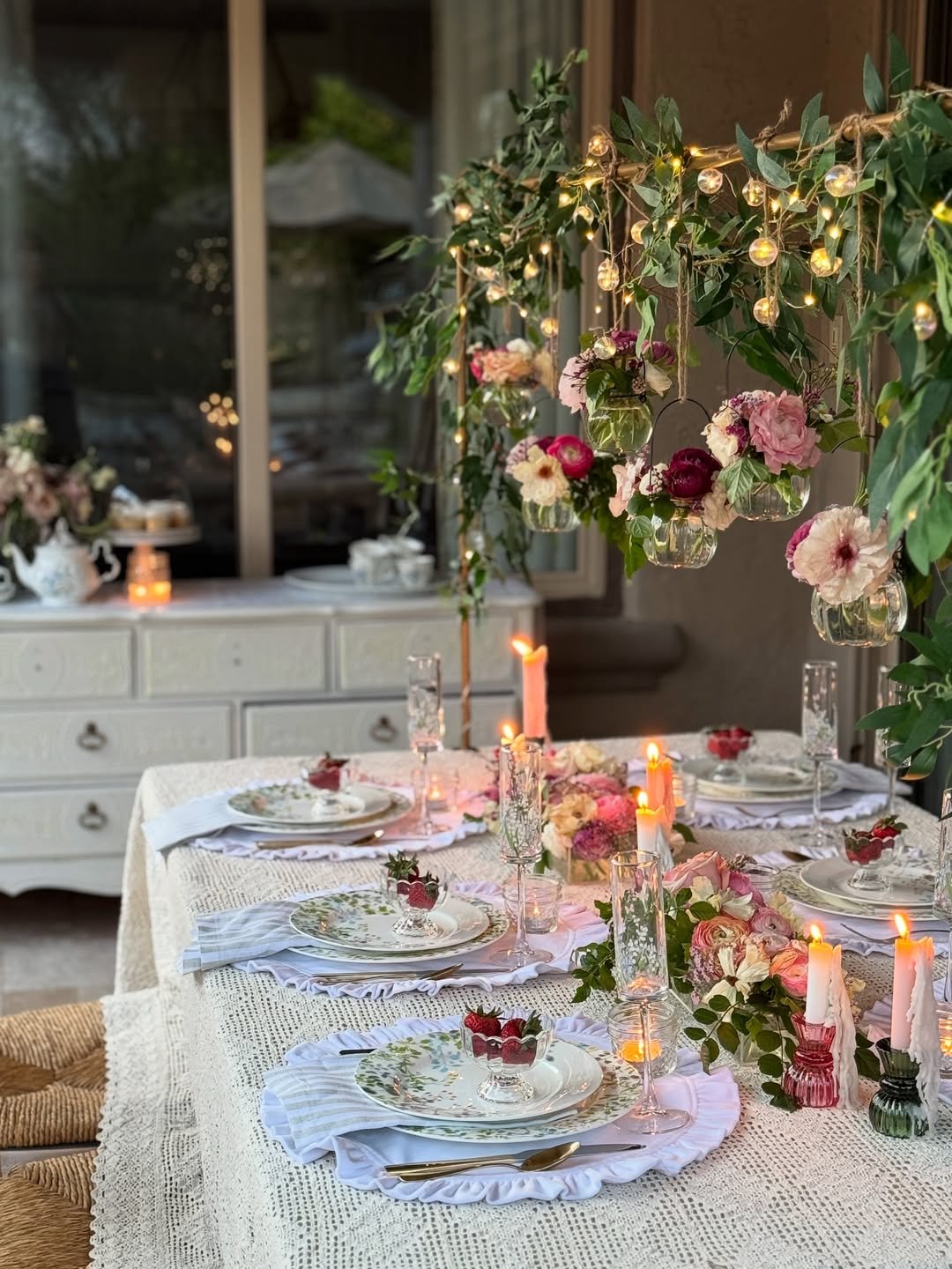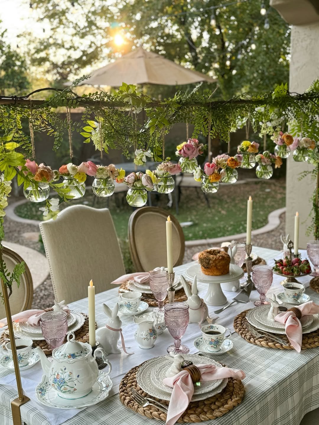 This one feels like a slow spring morning that turned into something special. Tiny glass jars filled with blooms hang overhead, catching the light just enough to feel magical without trying too hard.