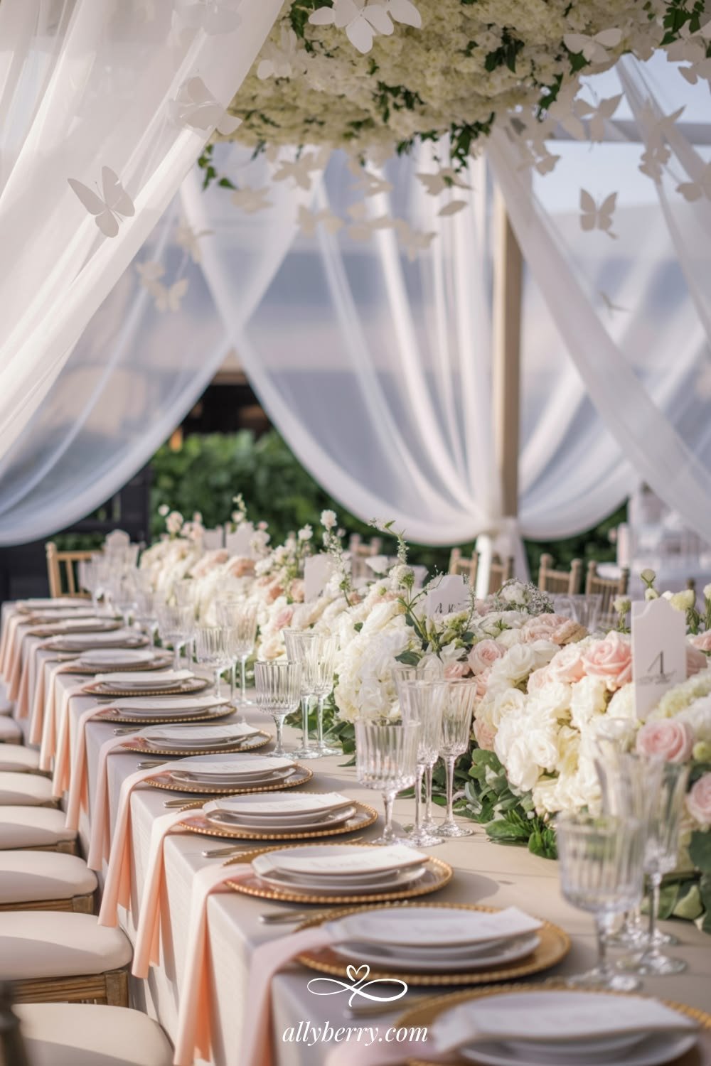 This tablescape feels like a scene set for a slow, sun-drenched celebration. Layers of soft blush linens, gold-rimmed plates, and cascading florals create a look that’s romantic without feeling overdone. The draped canopy above adds that dreamy, almost weightless quality, like everything is floating just slightly out of reach.