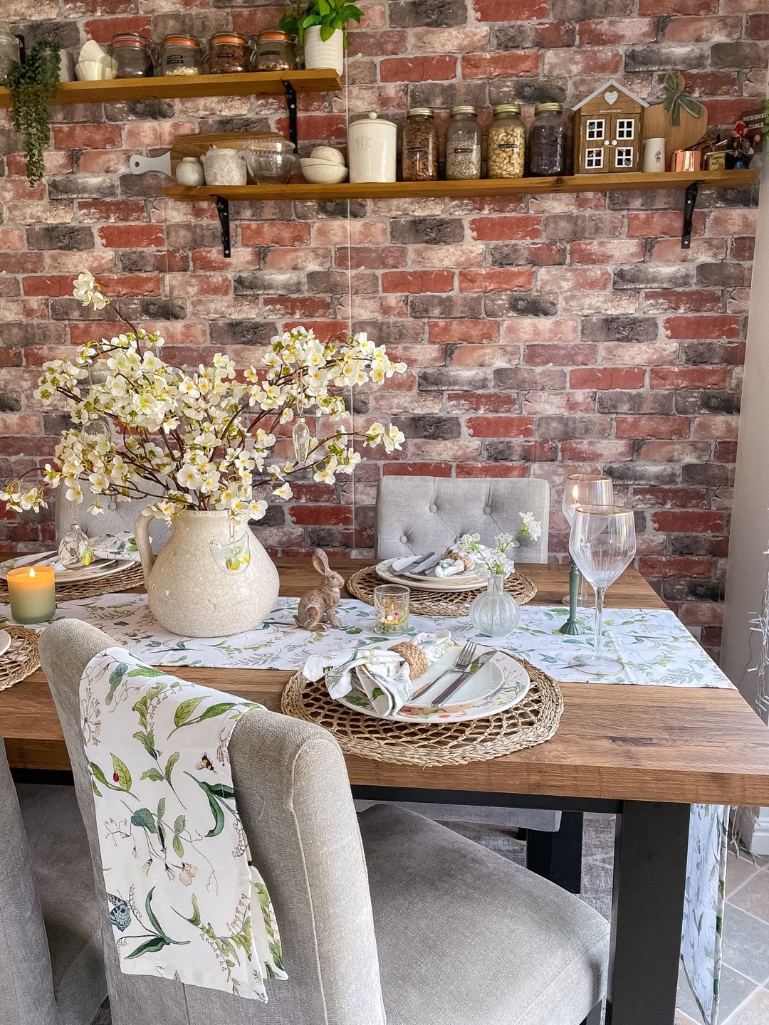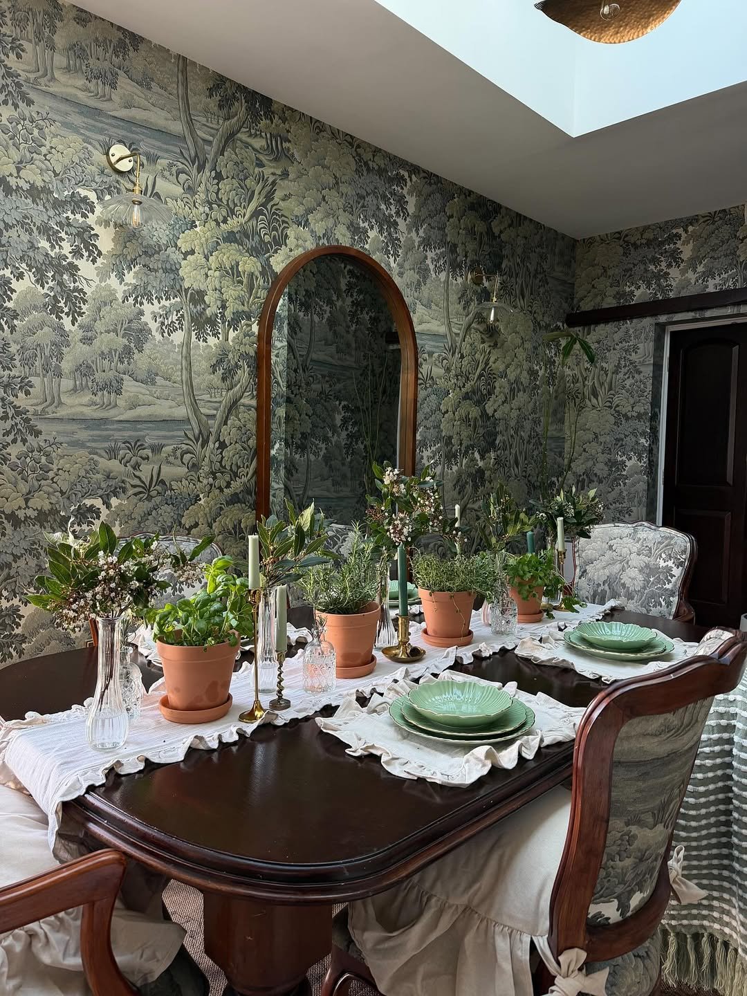 This space feels wrapped in greenery before you even notice the table. The wallpaper sets the tone, and then the potted herbs and soft ruffled linens carry that story right onto the tabletop.