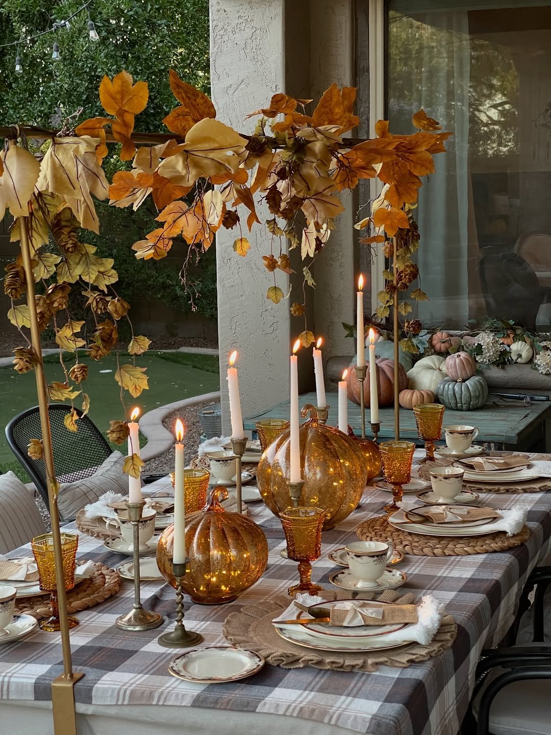 The arch of autumn leaves above adds just enough drama. It frames the table beautifully, turning a simple meal into something that feels a bit more like an occasion.