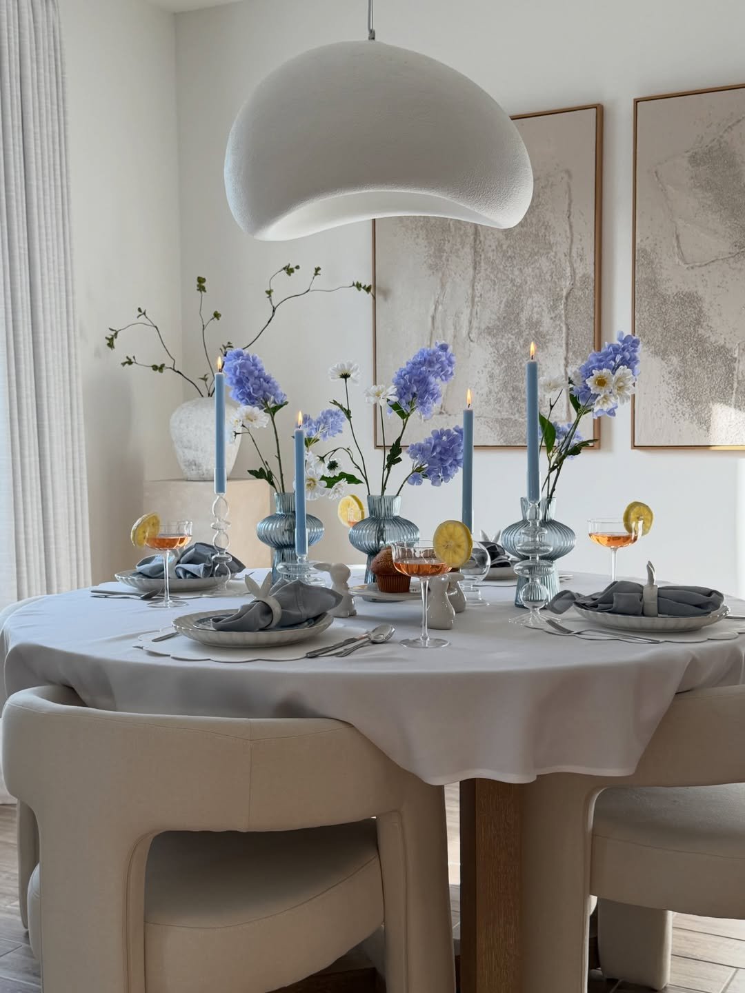 Clean lines, sculptural vases, and soft blue accents give this table a more contemporary edge. The florals are minimal but intentional, placed in a way that feels almost like a curated display.