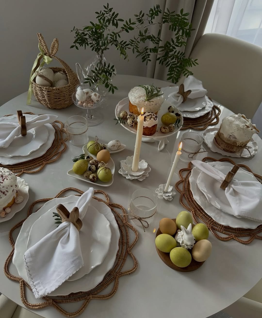Woven placemats, speckled eggs, and soft candlelight create a table that feels grounded and warm. There’s a natural rhythm to the arrangement, where textures do most of the storytelling.