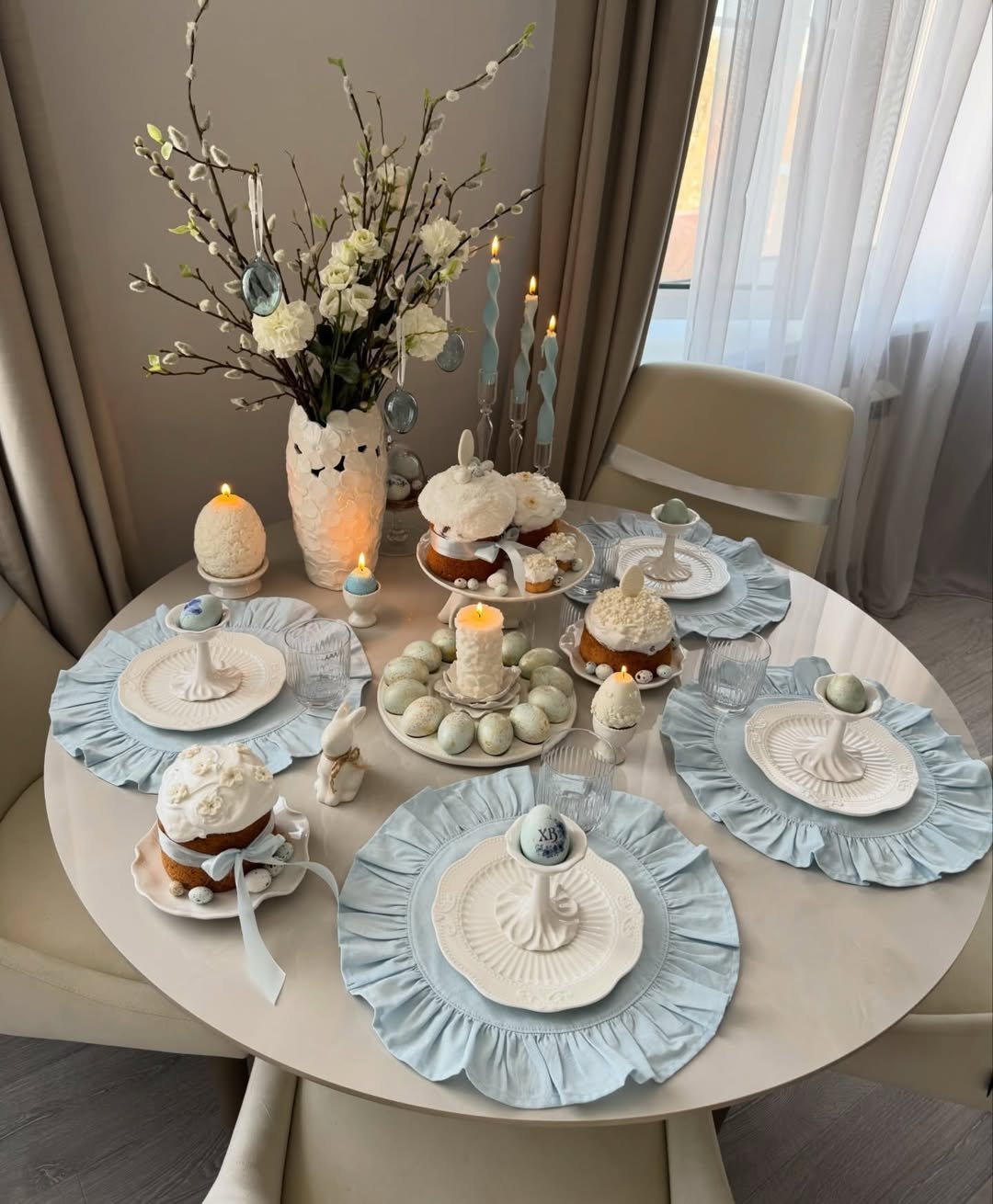 Soft blues and whites set the tone here, layered with delicate ruffles and gentle candlelight. The symmetry gives it a polished feel, while the small details keep it from feeling too formal.