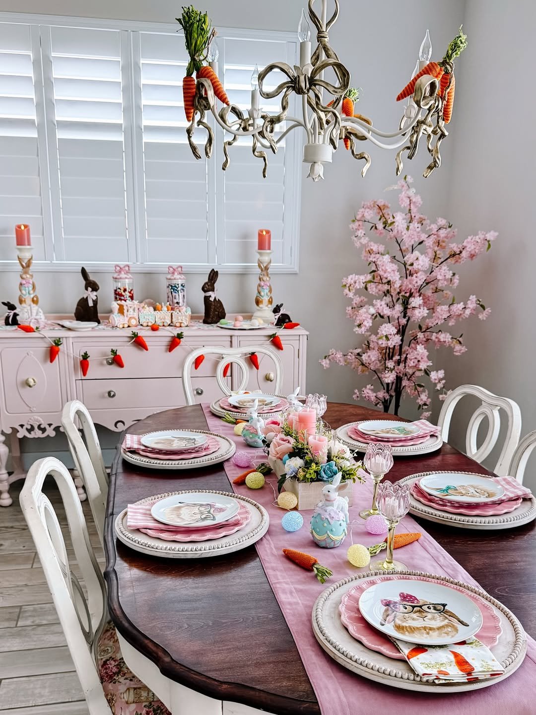 This one leans fully into the joy of the season. Soft pinks, bunny motifs, and those tiny carrot details create a table that feels cheerful and a little whimsical, without losing its sense of polish.
