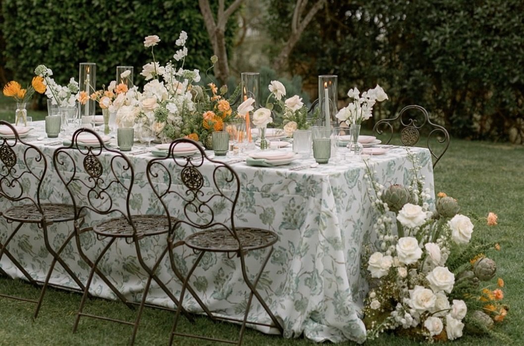 Everything here feels gently elevated. The muted floral linens, soft green glassware, and airy arrangements create a table that feels like it belongs in a tucked-away garden just before golden hour.