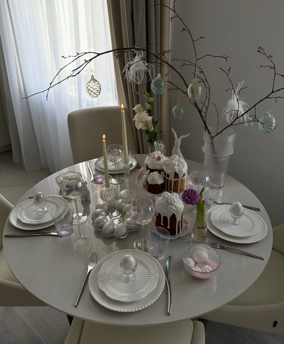 A clean white table layered with delicate glassware and subtle pastel accents feels calm in the best way. The hanging ornaments and feather details add just enough seasonal touch without cluttering the space.