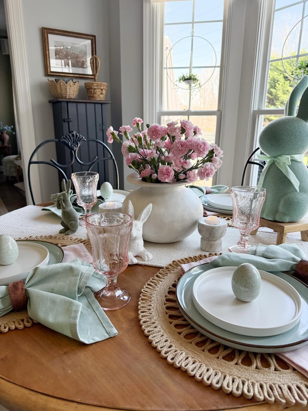 Muted greens, blush tones, and soft pink glassware create a table that feels gentle and welcoming. The bunny accents and simple florals add just enough personality without overwhelming the space.