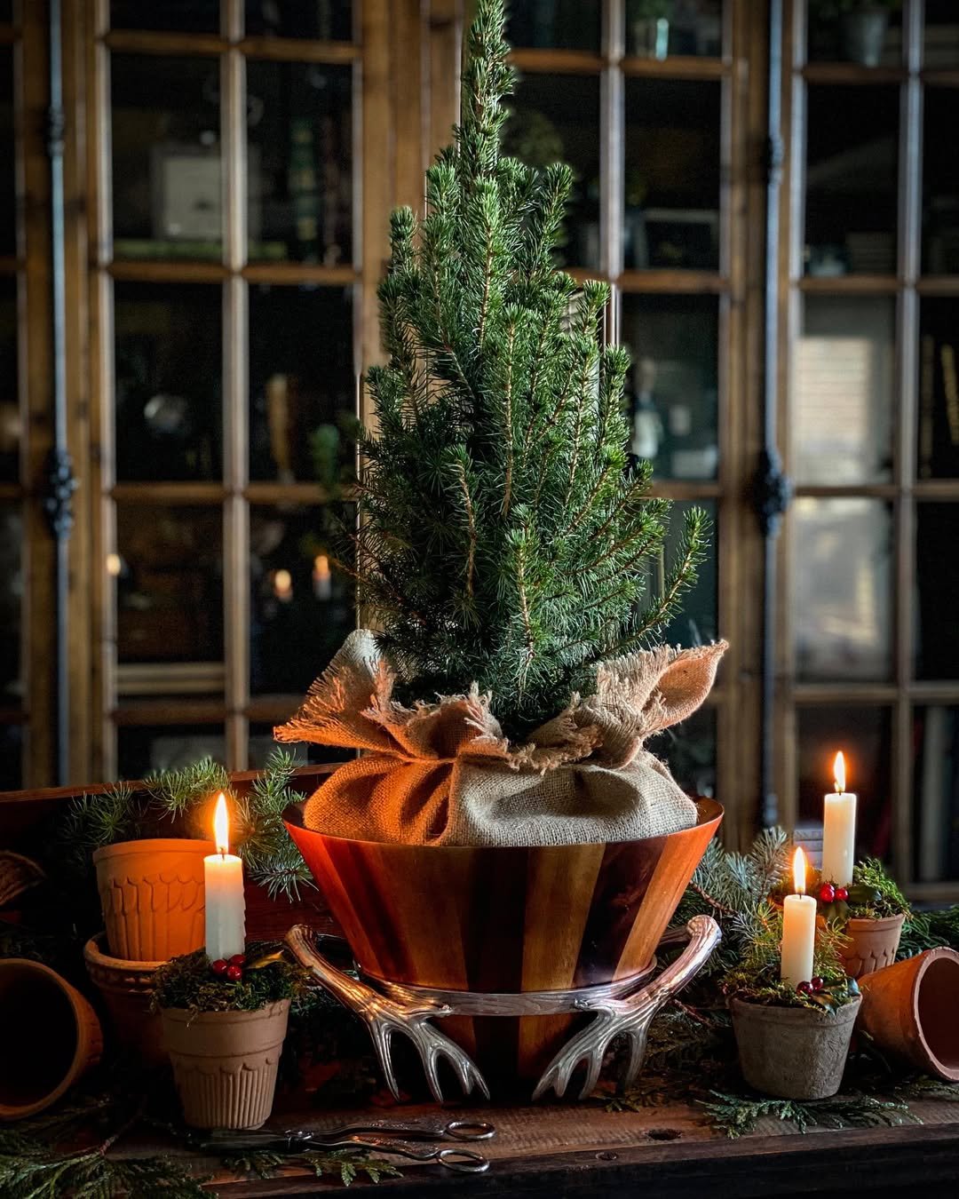 A small tree as a centerpiece brings a quiet, earthy presence to the table. Surrounded by soft candlelight and natural textures, it creates a scene that feels calm and rooted.