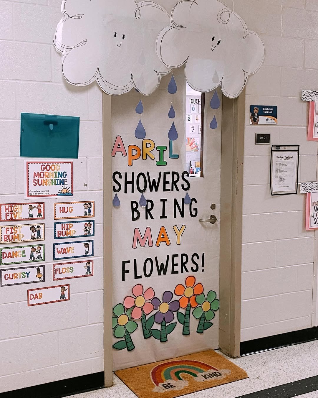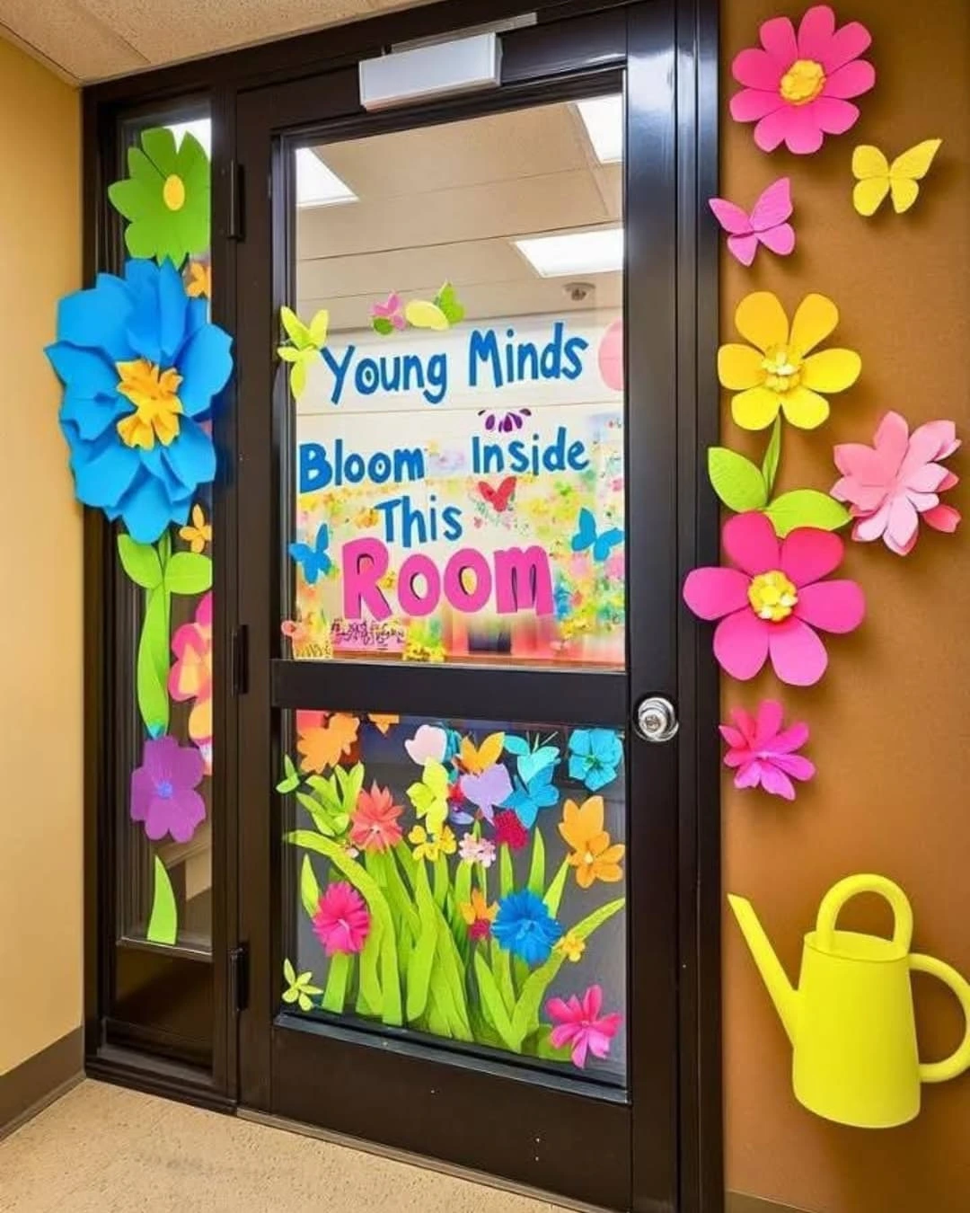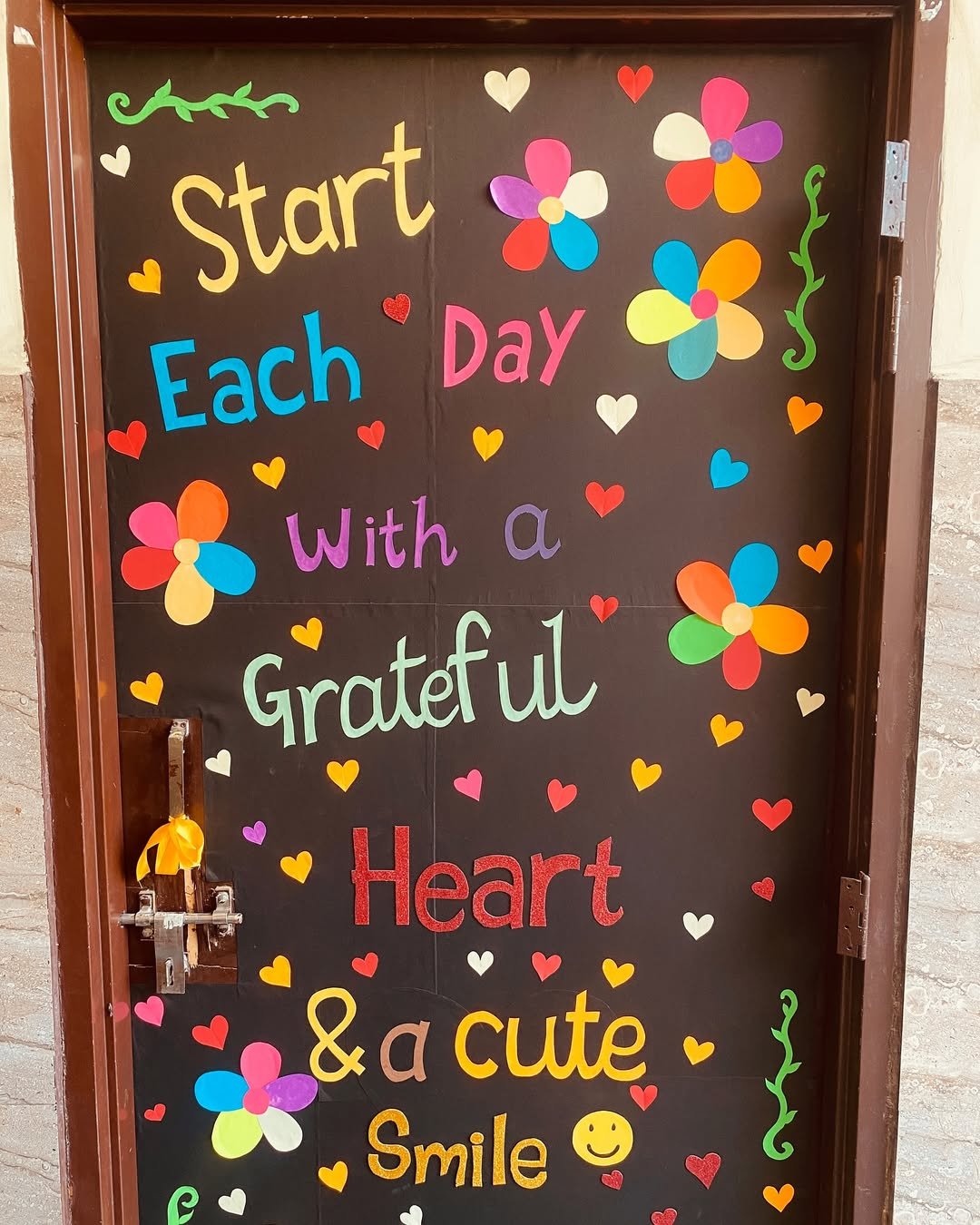This door feels like a burst of positivity the second you see it. Bright cut-out flowers, scattered hearts, and that uplifting message layered across a deep backdrop create something that feels both playful and grounding.