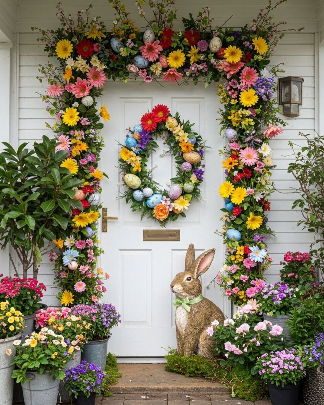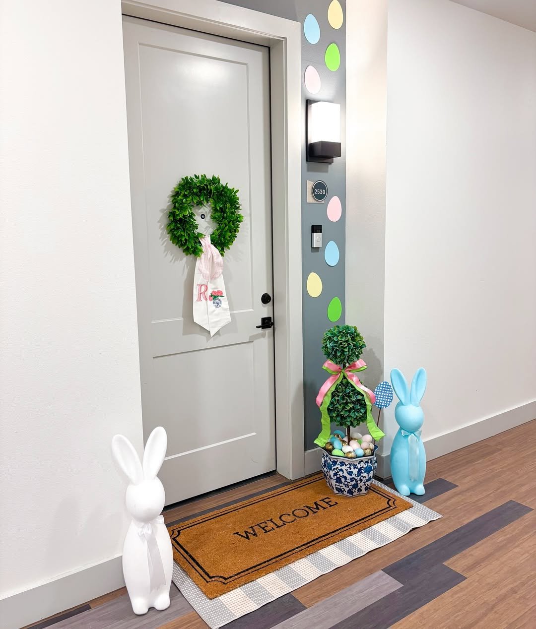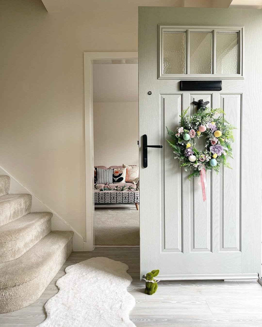 This entry feels calm and considered. A simple wreath, pastel eggs, and subtle bunny accents create a look that’s gentle and inviting.