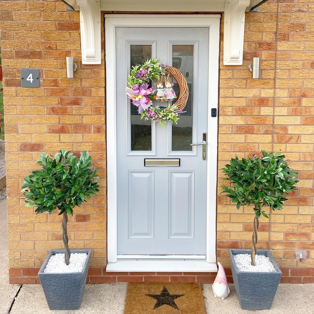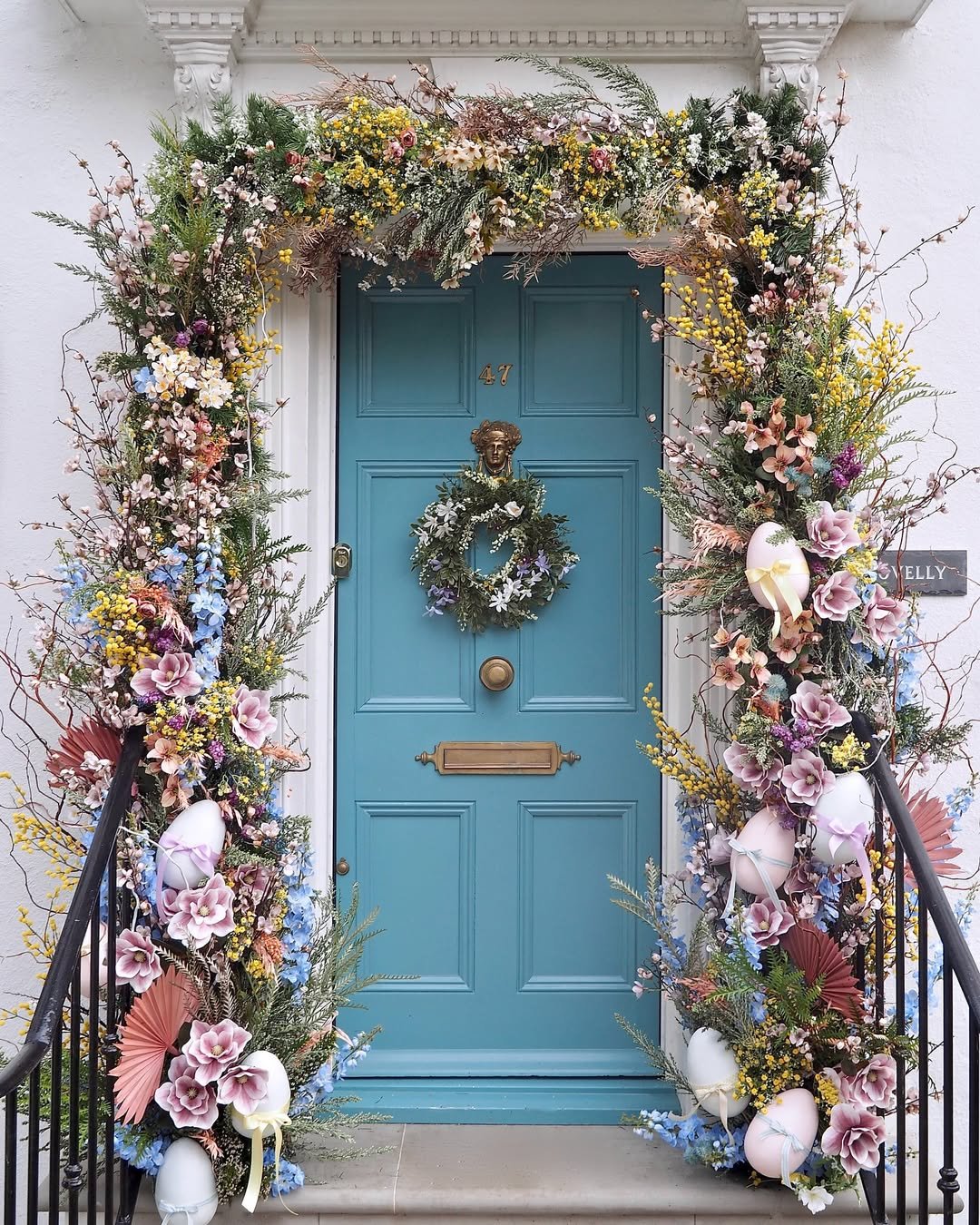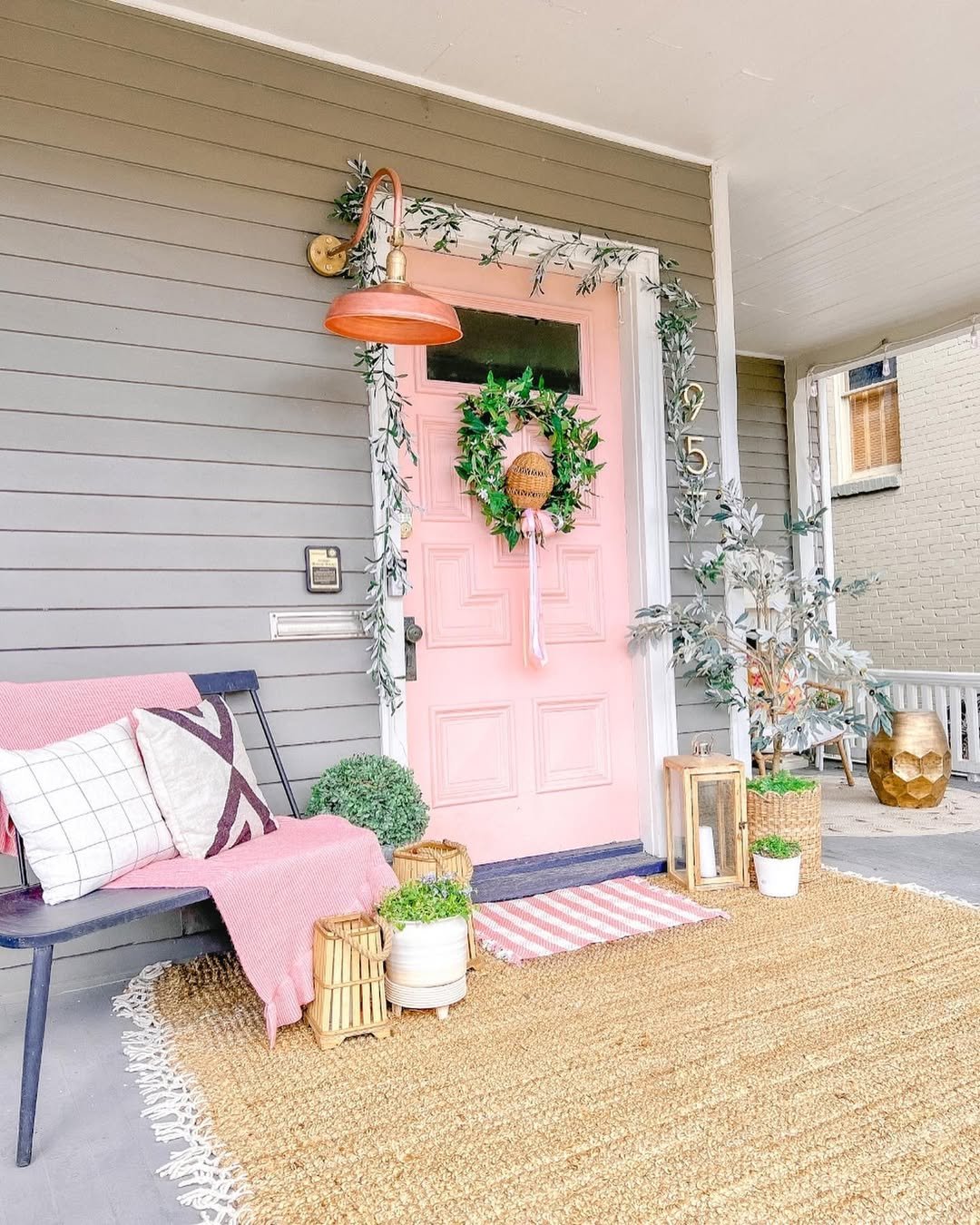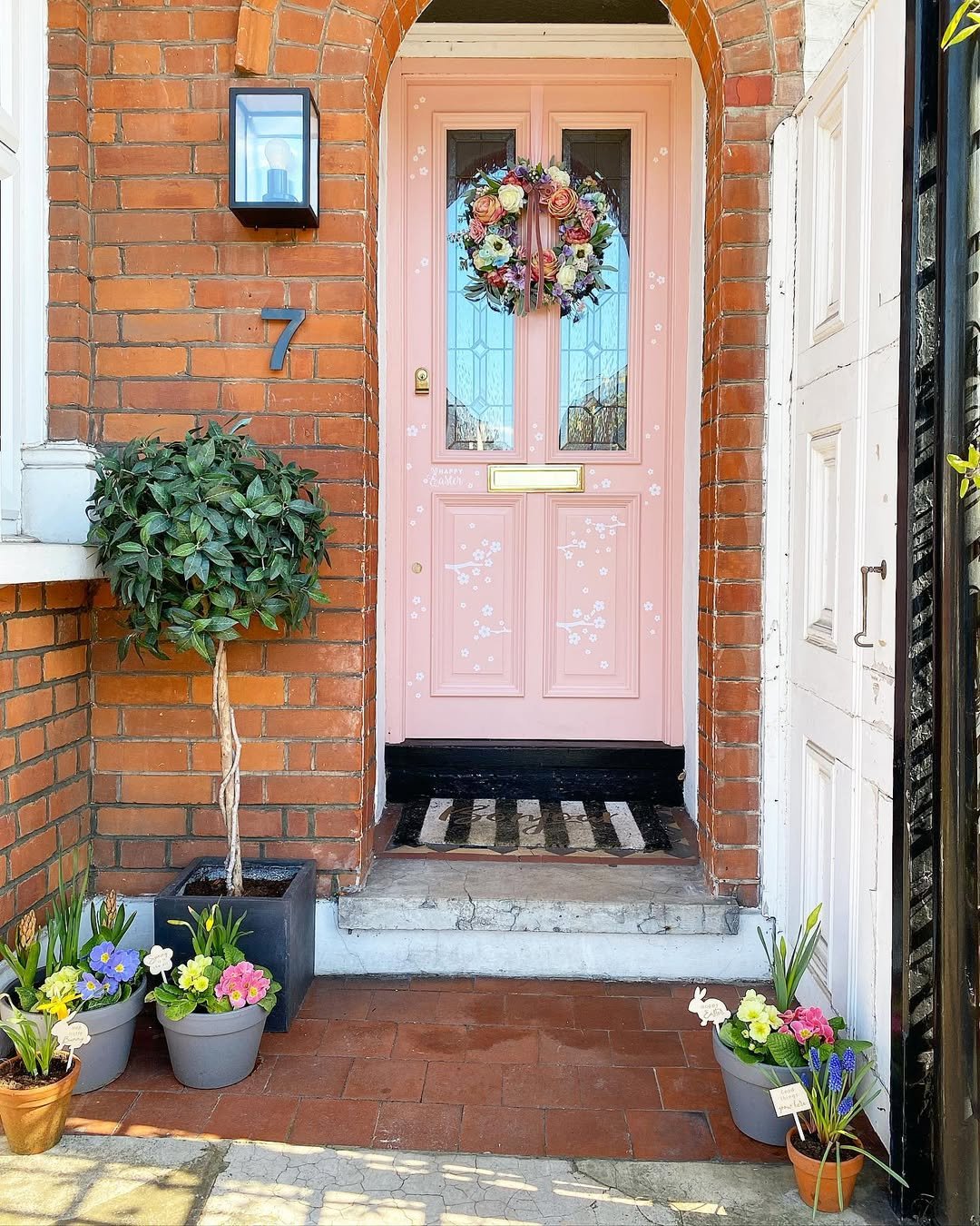That soft pink door already sets the tone, but the floral wreath takes it further. It feels romantic, a little playful, and perfectly in tune with early spring blooms.