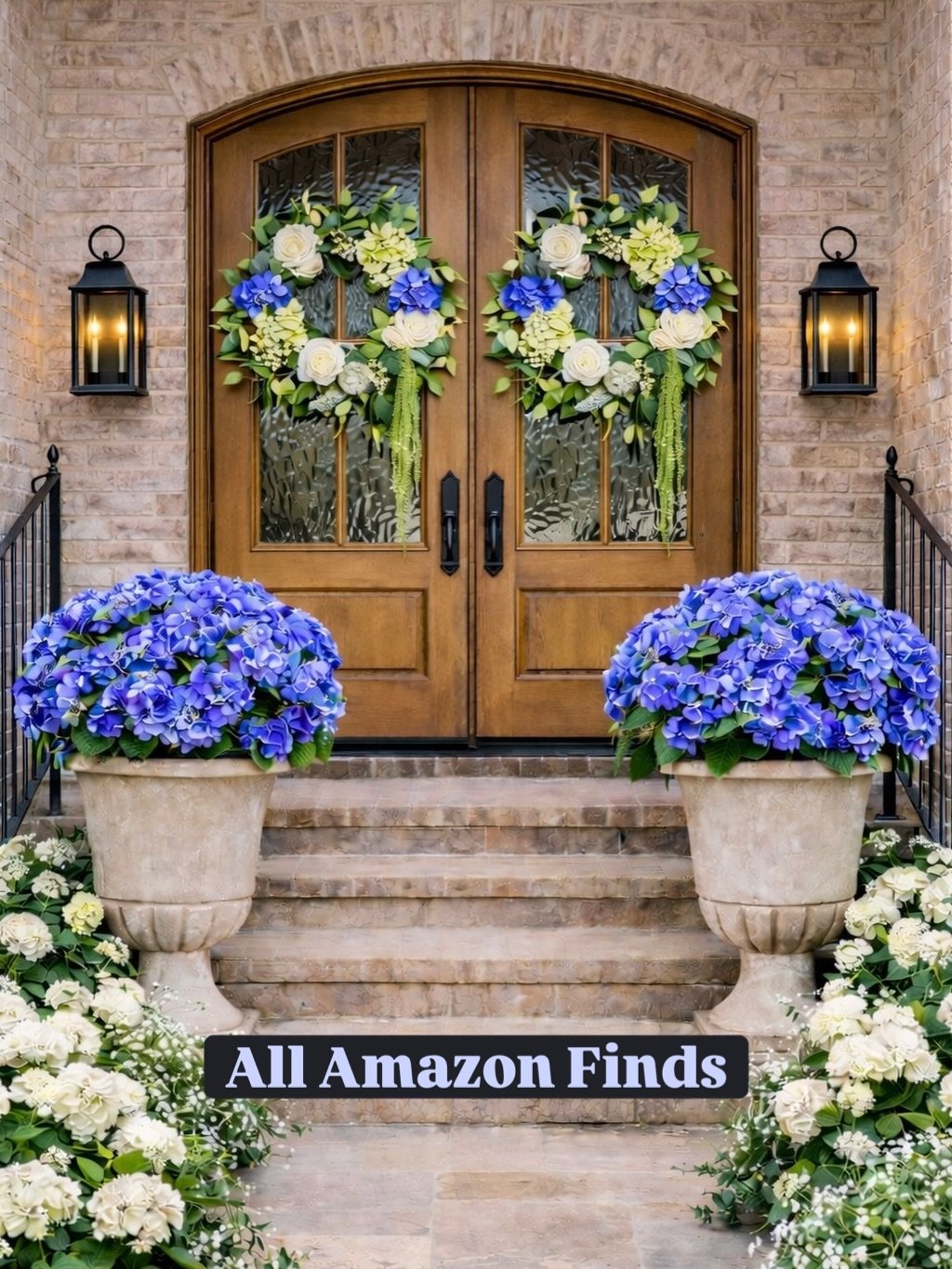 There’s a sense of balance here that feels timeless. Matching wreaths, structured planters, and soft blue tones create a polished, welcoming entry.