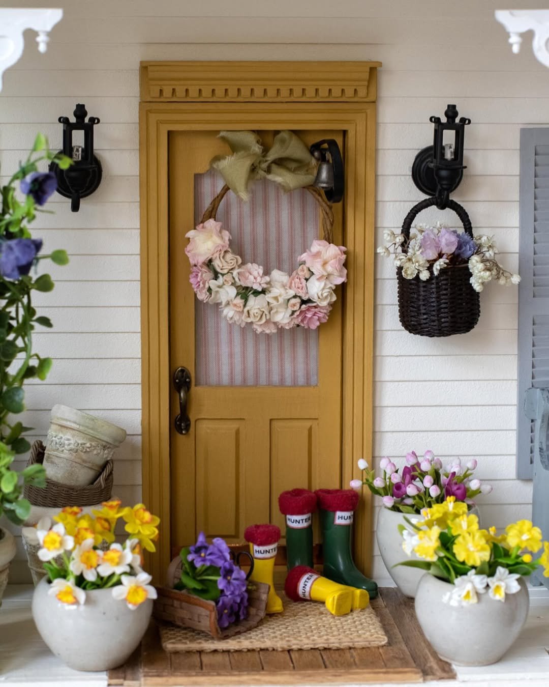 This tiny scene feels like a storybook brought to life. A petite wreath, blooming pots, and the sweetest little rain boots create a world that feels both detailed and delicate.