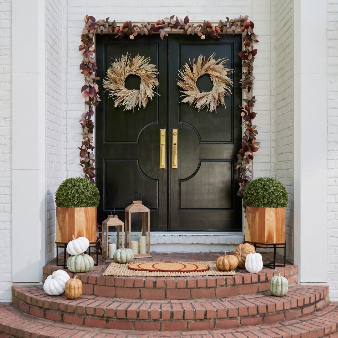 This entry leans into calm, earthy tones that feel collected rather than styled. Muted pumpkins, warm wood planters, and soft greenery create a look that bridges seasons effortlessly.