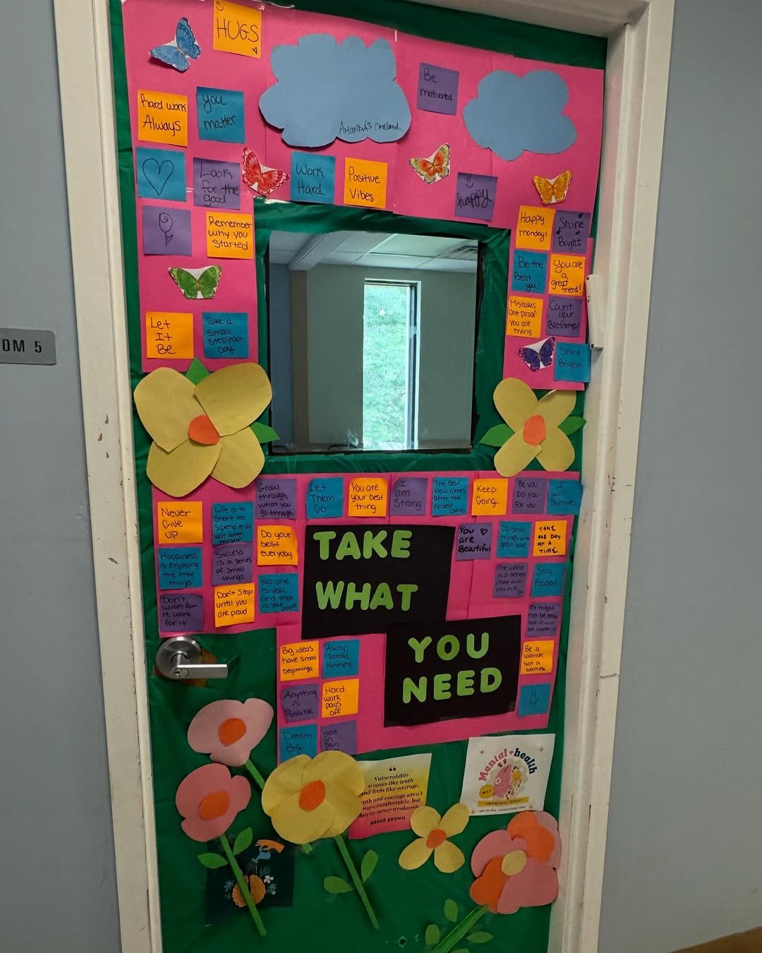 This one feels deeply personal. Layers of handwritten notes, affirmations, and bright colors turn the door into a living collage of encouragement.