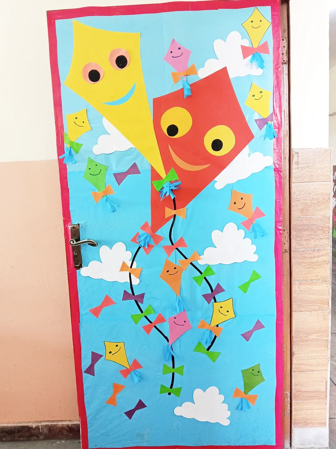 This door feels like stepping into a child’s imagination. Bright kites dance across a sky-blue backdrop, each one smiling as if caught mid-flight on a perfect breezy afternoon.