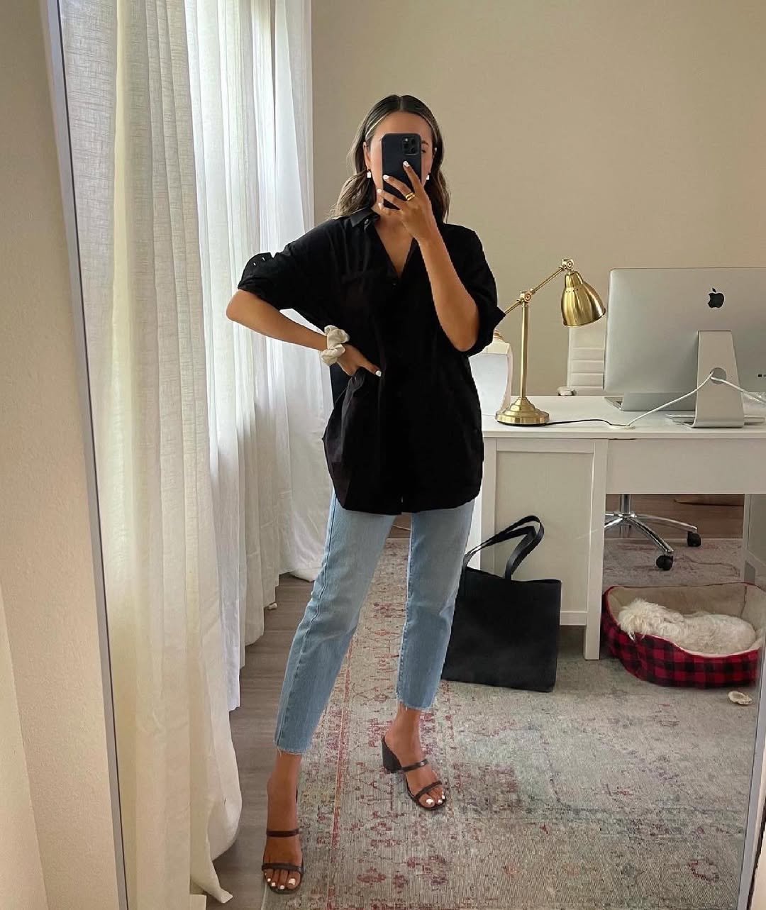A black button-down styled with slim straight jeans creates a sharp, balanced look that works from desk to dinner. The slight crop at the ankle gives it that tailored feel.
