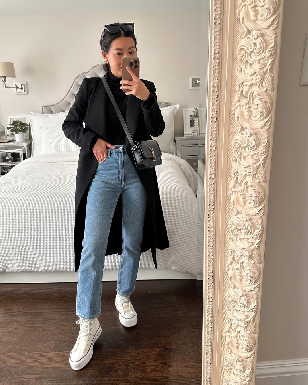 A sleek black turtleneck layered under a structured black coat with straight-leg jeans is timeless. The clean lines and monochrome top half make the denim feel elevated.