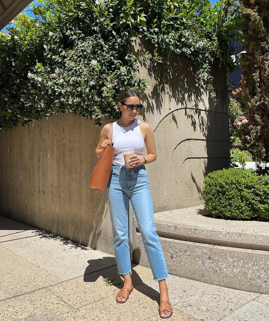 A fitted white tank tucked into straight-leg light wash jeans is the kind of formula that never fails. The silhouette is simple, but the warm leather tote and matching sandals bring in that rich, sunlit contrast.