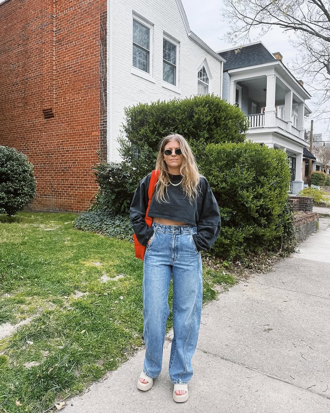 A cropped black sweatshirt with wide-leg jeans brings that laid-back, off-duty vibe. The high rise keeps proportions flattering, while chunky sandals add a hint of retro cool.