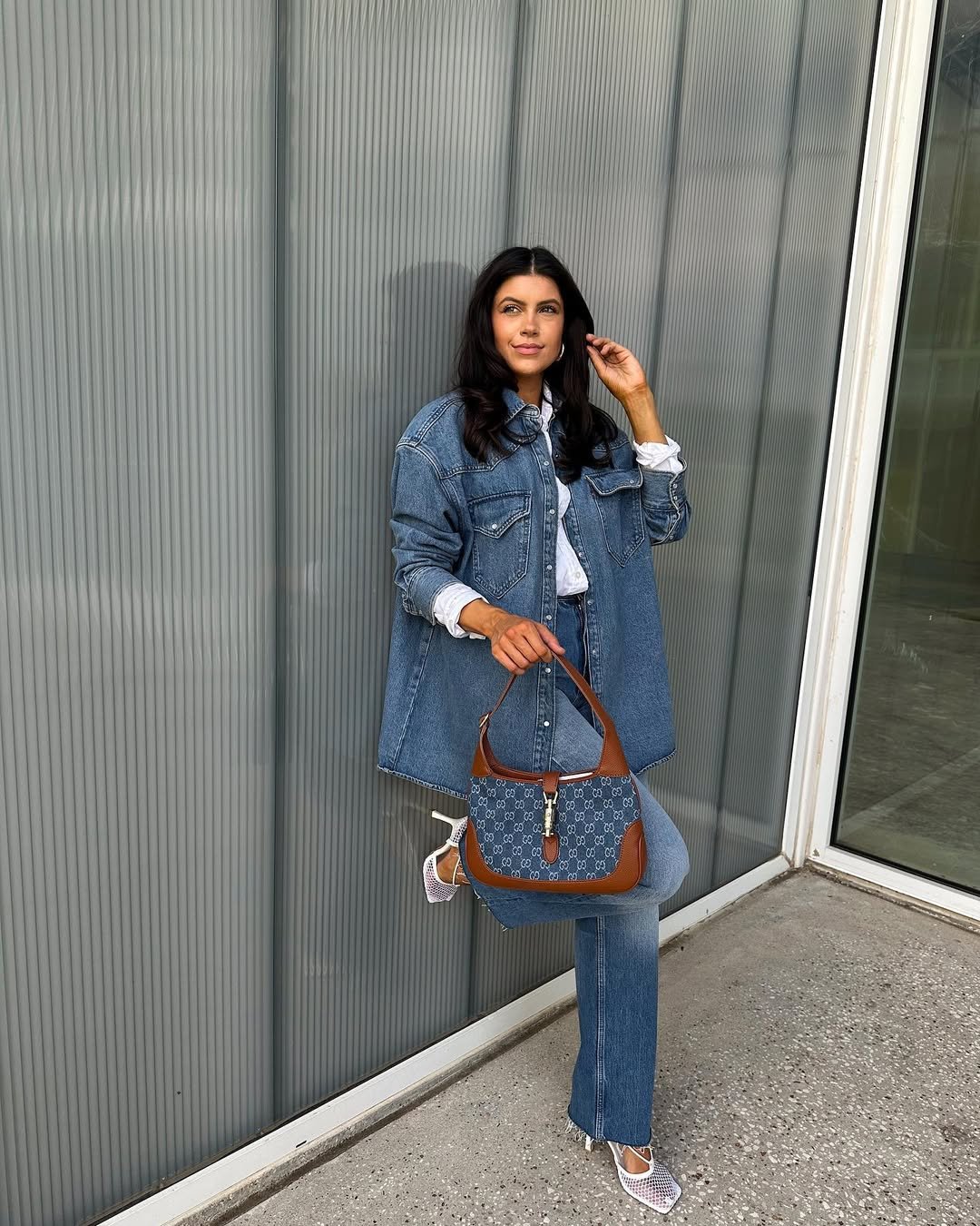 An oversized denim shirt layered over a fitted white top with matching jeans creates depth through texture. The structured designer bag and pointed flats bring in a polished finish.