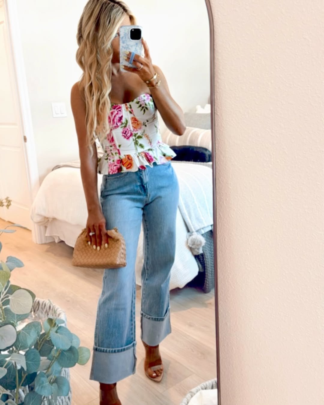 A floral peplum top tucked into wide cuffed jeans brings in a hint of romance. The structured bodice contrasts beautifully with the relaxed hemline of the denim.
