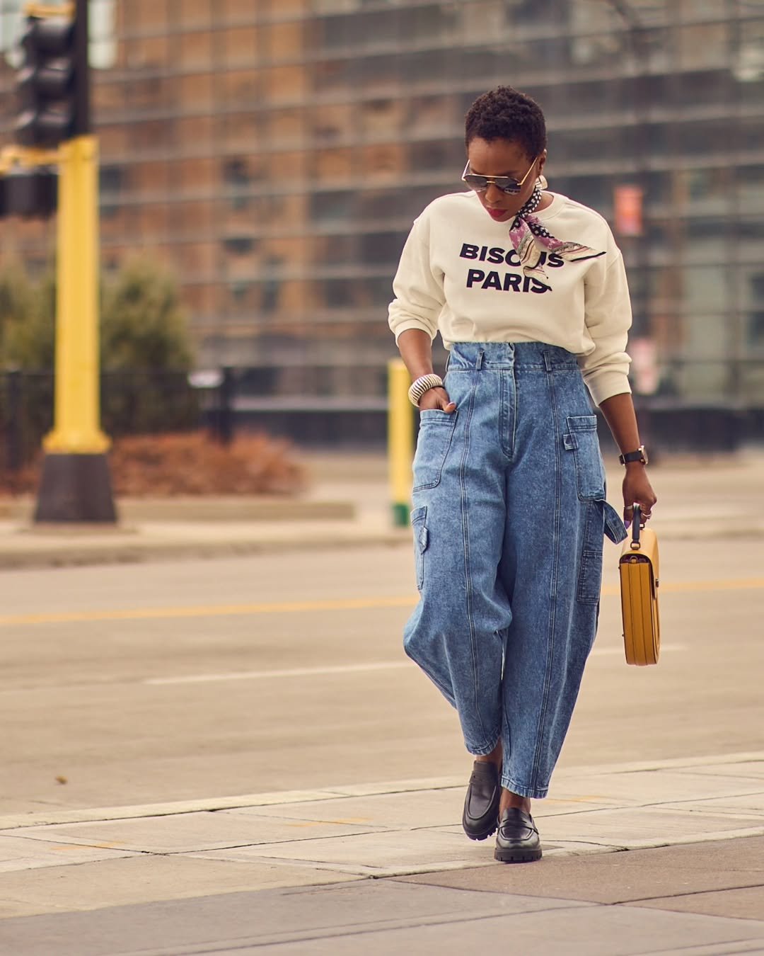 High-waisted utility-style jeans styled with a bold graphic sweatshirt feel confident and relaxed. The structured denim balances the casual top, and loafers give it a slightly polished finish.