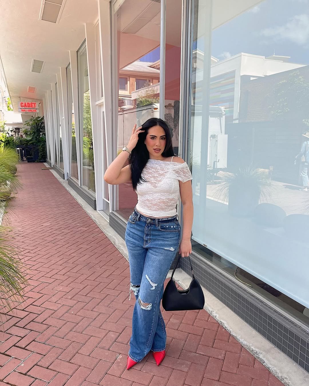 An off-shoulder lace top paired with distressed flares brings in texture and attitude all at once. The red pointed heels shift the entire mood from casual to confident in seconds.